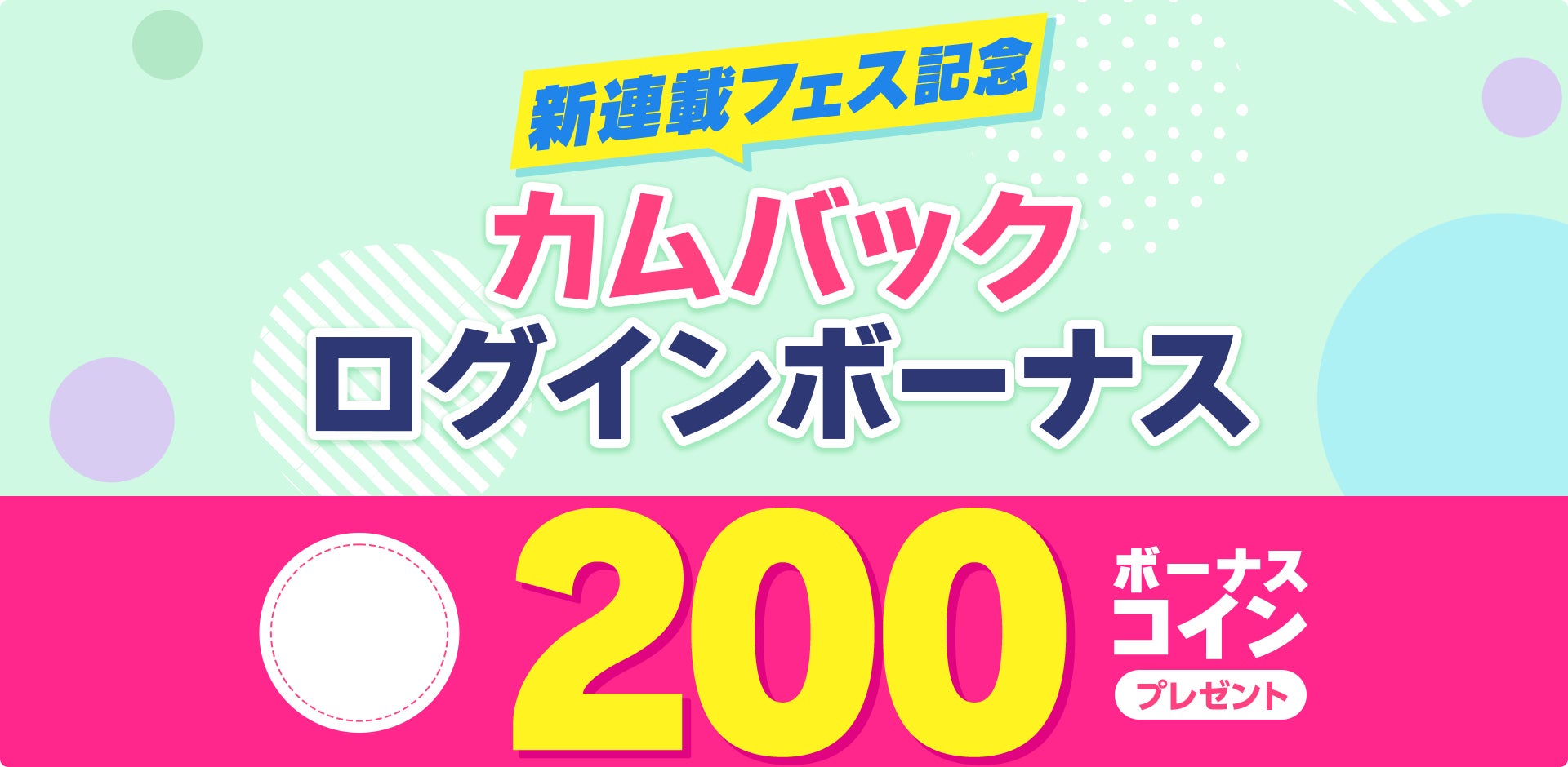 また、期間中に『新連載フェス』開催を記念して、『カムバックログインボーナス』を行います。復帰ユーザーの方を対象に、200ボーナスコインをプレゼントいたします。