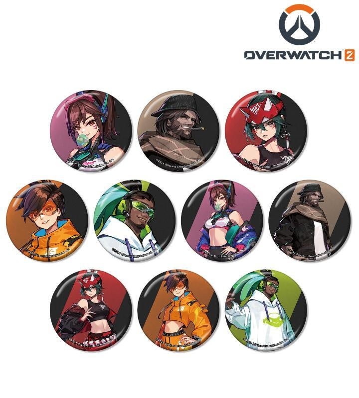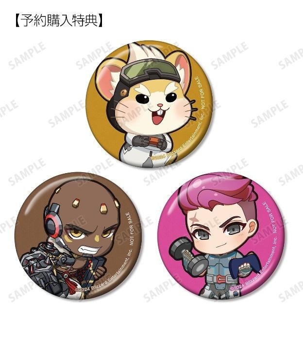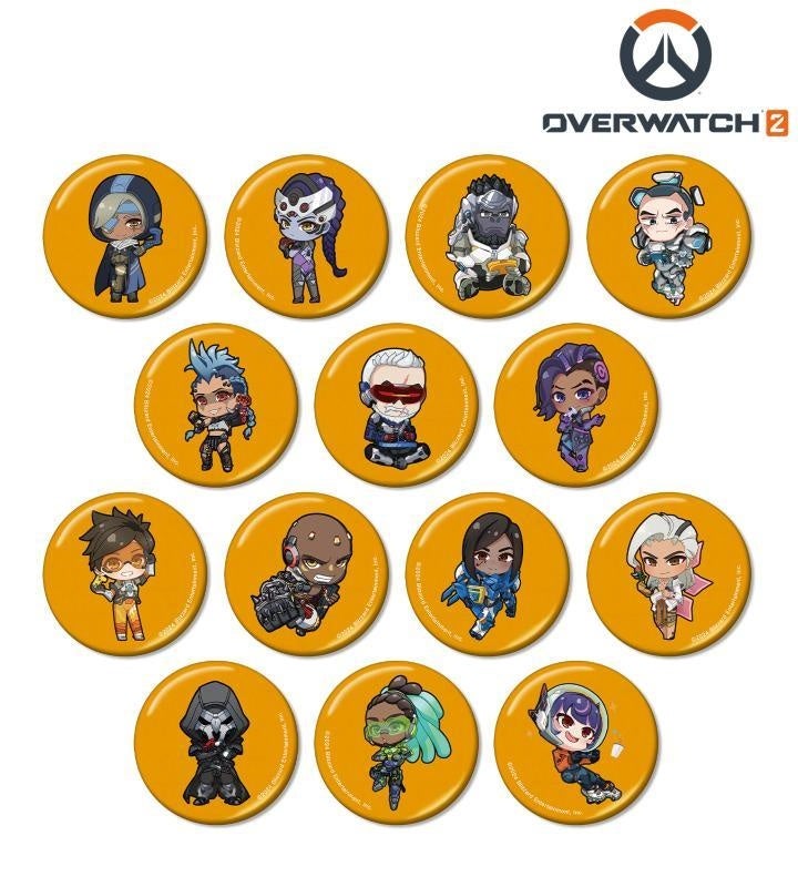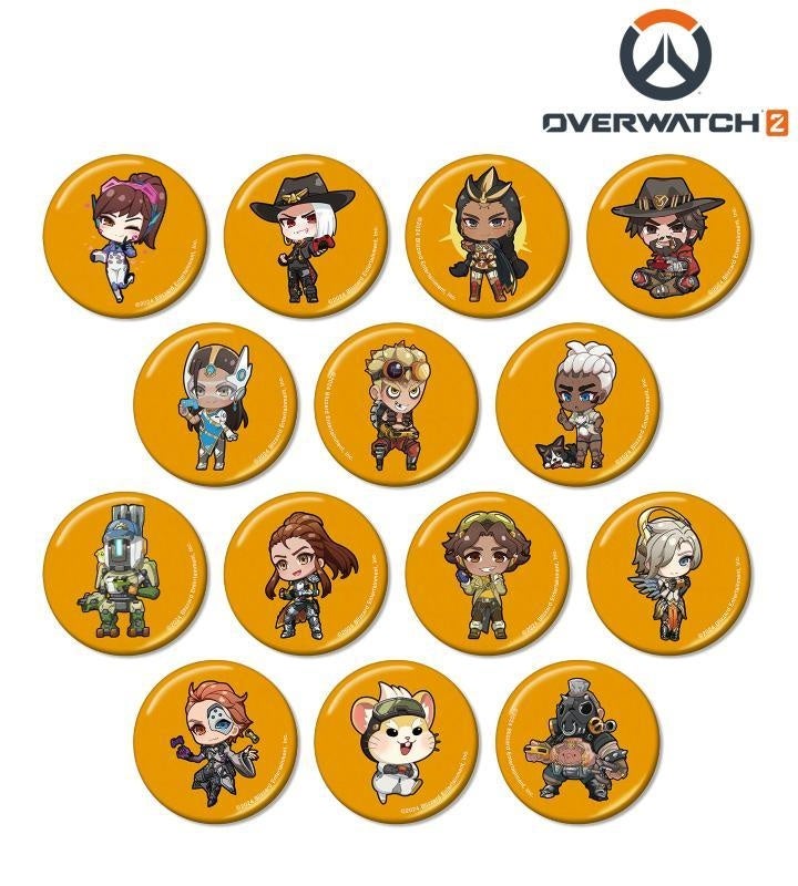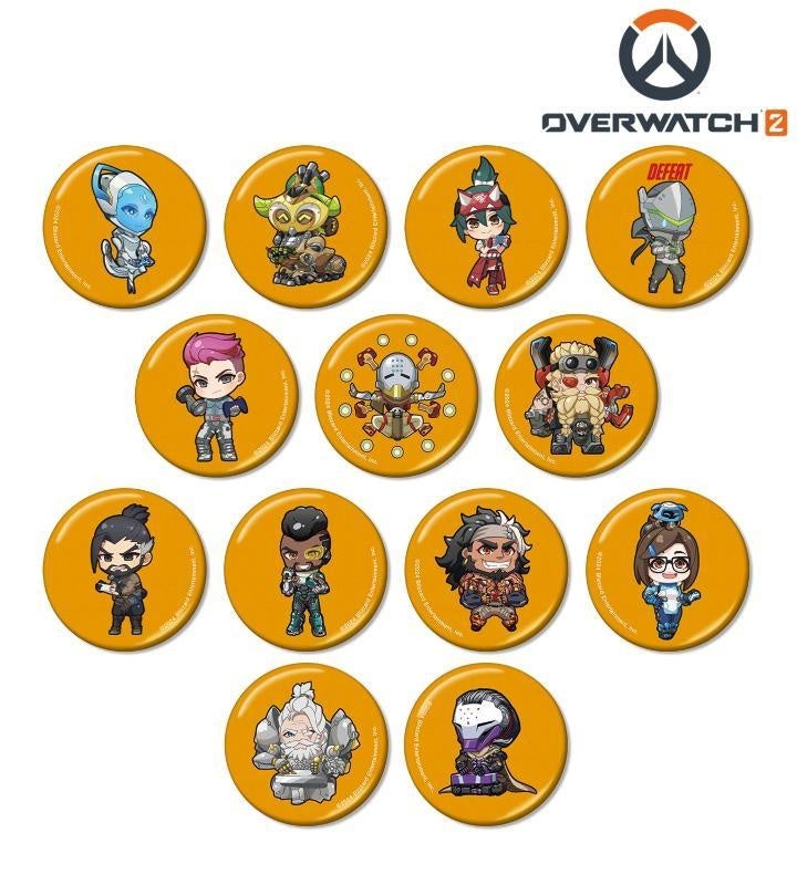 アナ、ウィドウメイカー、ウィンストン、シグマ、ジャンカー・クイーン、ソルジャー76、ソンブラ、トレーサー、ドゥームフィスト、ファラ、ライフウィーバー、リーパー、ルシオ、ジュノのちびキャライラストをメタリック仕様の缶バッジに仕上げました。