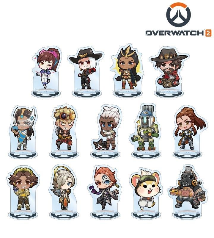 エコー、オリーサ、キリコ、ゲンジ、ザリア、ゼニヤッタ、トールビョーン、ハンゾー、バティスト、マウガ、メイ、ラインハルト、ラマットラのちびキャライラストをアクリルスタンドに仕上げました。