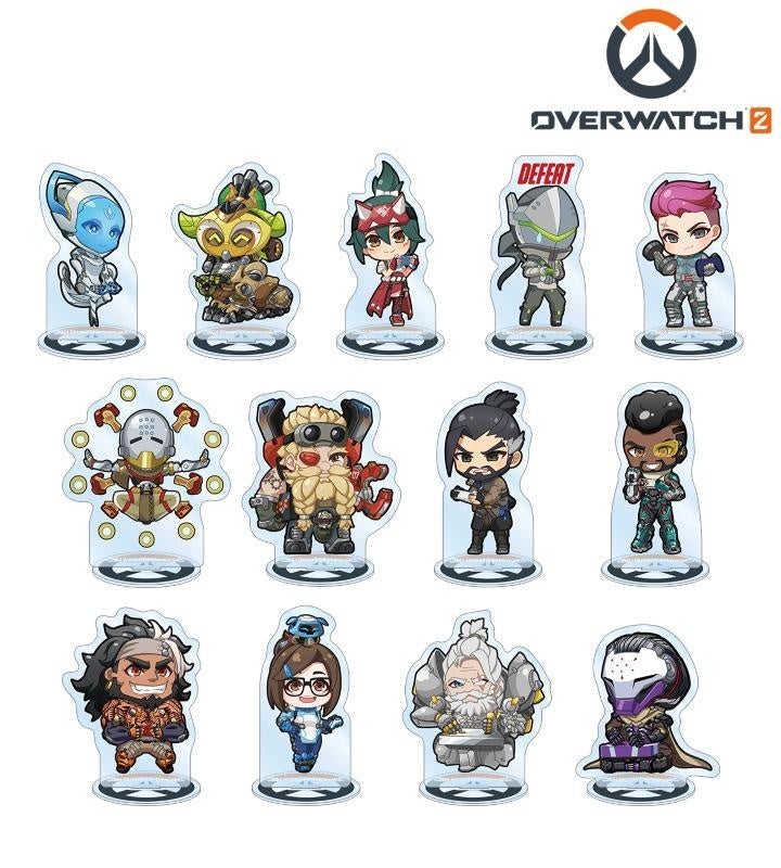 D.Va、アッシュ、イラリー、キャスディ、シンメトラ、ジャンクラット、ソジョーン、バスティオン、ブリギッテ、ベンチャー、マーシー、モイラ、レッキング・ボール、ロードホッグのちびキャライラストをアクリルスタンドに仕上げました。