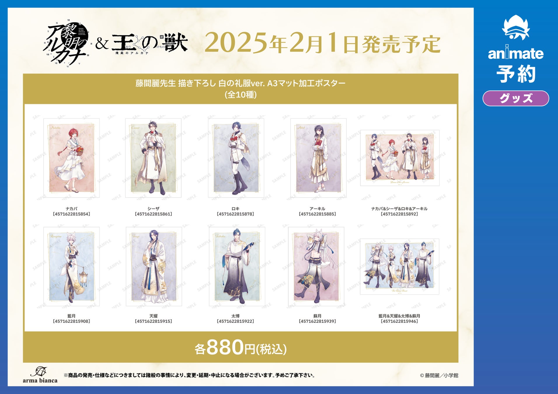 今回のフェアでは、藤間麗先生による「黎明のアルカナ」&「王の獣~掩蔽のアルカナ~」の「白の礼服」をコンセプトにした新規描き下ろしイラストを使用した新商品を多数先行販売する他、フェア特典を予定しております。