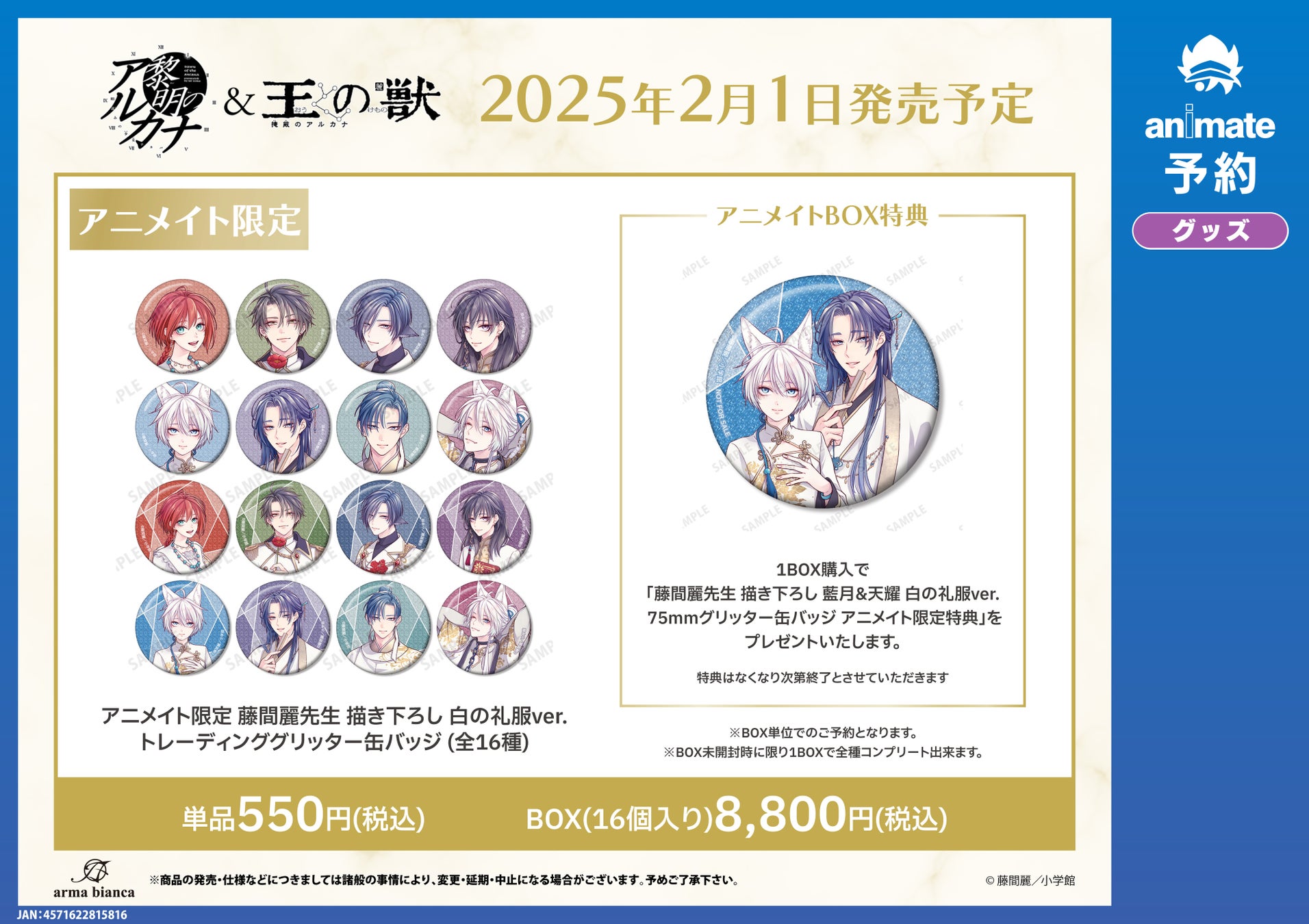 1BOX購入で「藤間麗先生 描き下ろし 藍月&天耀 白の礼服ver. 75mmグリッター缶バッジ アニメイト限定特典」をプレゼントいたします。