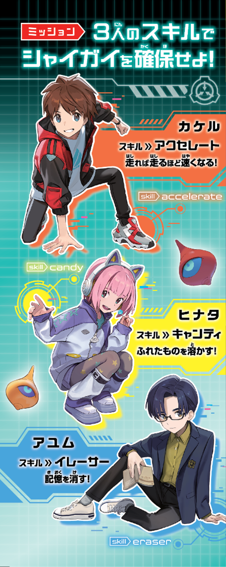 しかし、本作の主人公たちには特殊スキルがあります。主人公のカケルには、走れば走るほど加速する「アクセレート」。ヒナタには、触れたものを溶かしてしまう「キャンディ」。アユムには、手で触れたものに関する情報を、左手で触れた生物の記憶から消し去る「イレーサー」。これらのスキルを駆使して、どうシャイガイ確保をするのか!? SCPがはじめての方も、SCPがずっと好きな方も必見の1冊です!