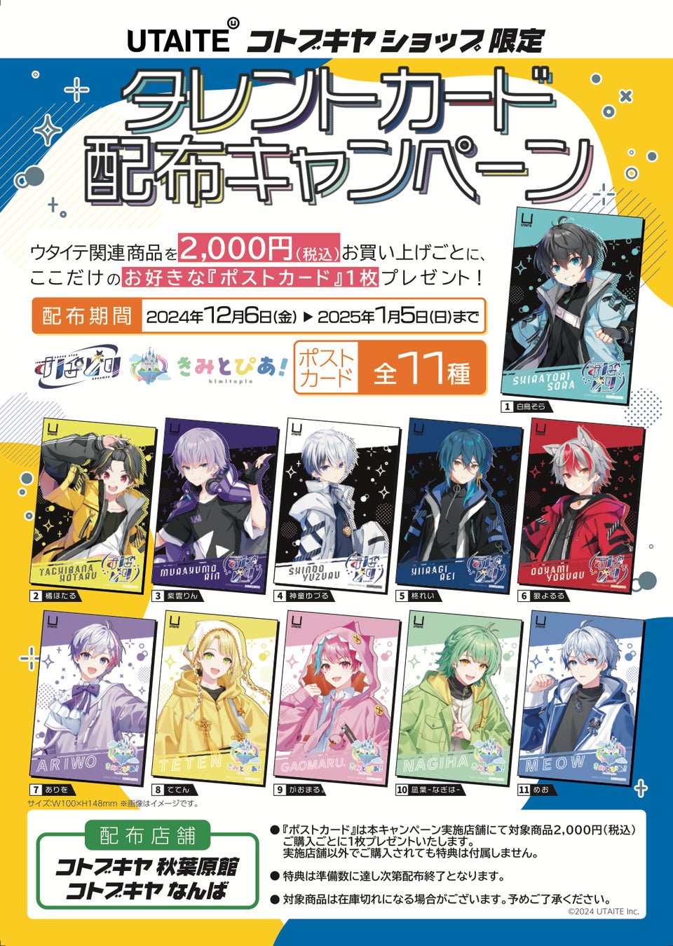 2024年12月6日(金)〜1月5日(日)の期間中、コトブキヤ期間限定ポップアップショップにてウタイテ関連商品を2,000円(税込)お買い上げごとにお好きな『ポストカード(全11種)』を1枚プレゼントいたします。