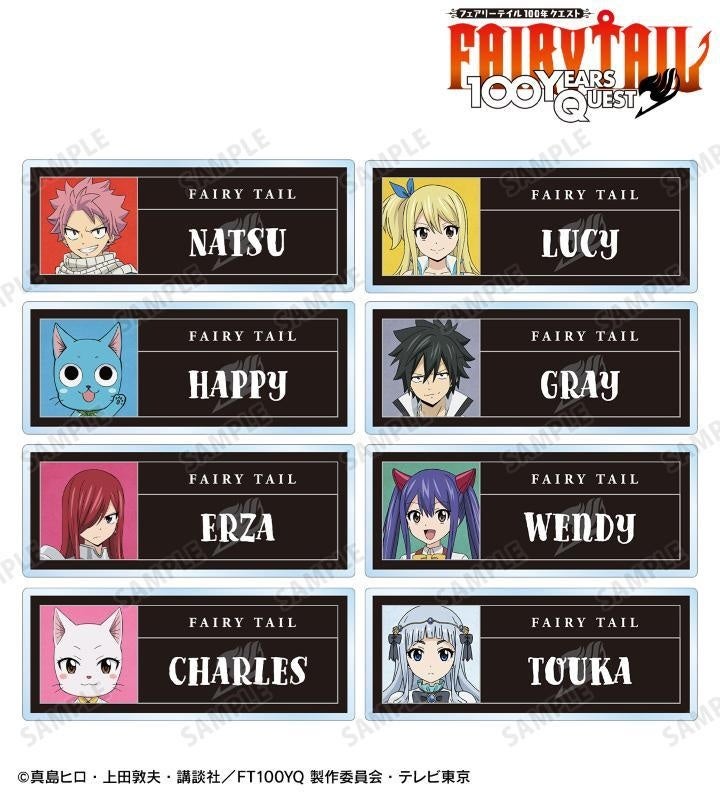 ナツ・ドラグニル、ルーシィ・ハートフィリア、ハッピー、グレイ・フルバスター、エルザ・スカーレット、ウェンディ・マーベル、シャルル、トウカのイラスト、キャラクターの名前をアクリルネームプレートに仕上げました。