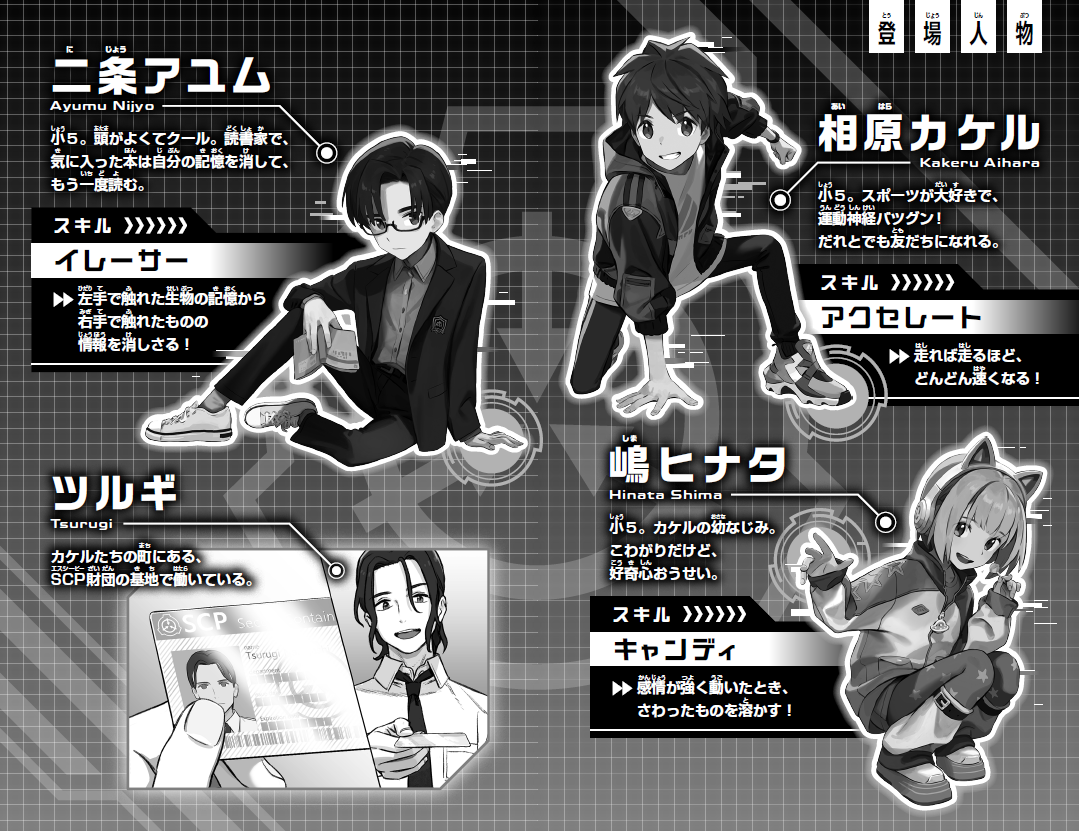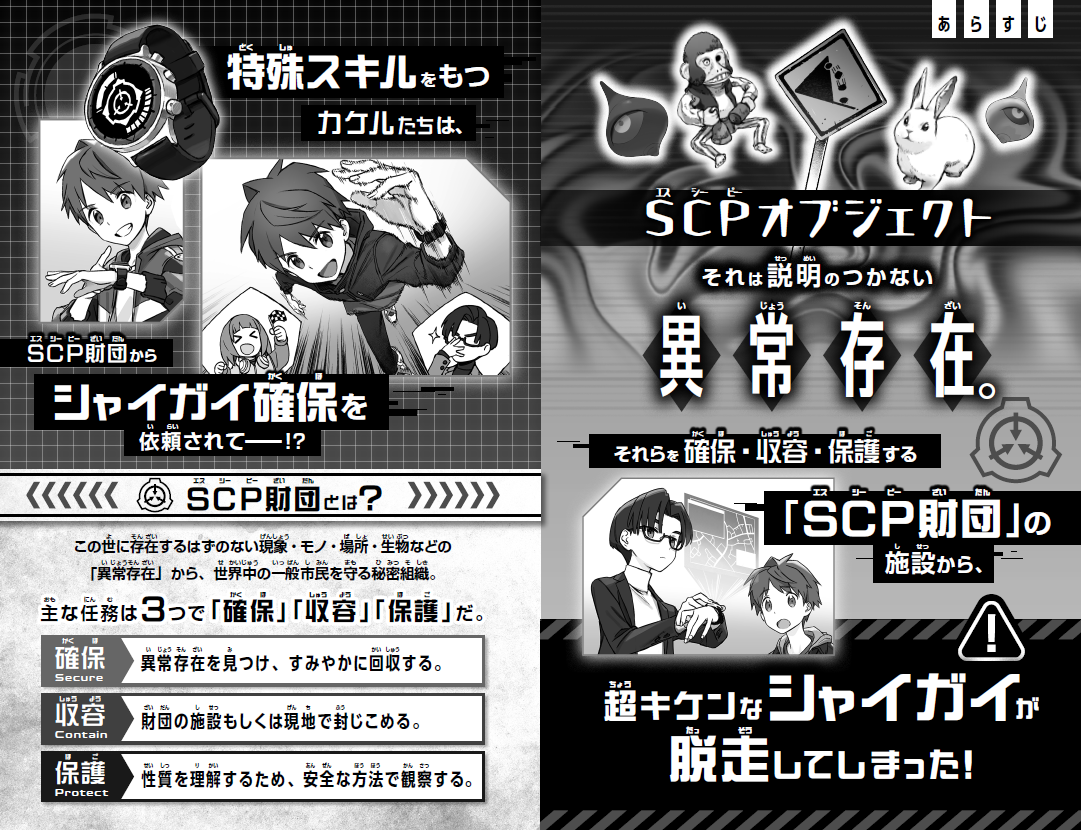 SCPオブジェクト。それは、説明のつかない異常な存在。それらを確保・収容・保護する「SCP財団」の施設から、なんと超キケンなシャイガイが脱走してしまった! 特殊スキルをもつ主人公・カケルたち3人は、SCP財団から、シャイガイ確保のミッションを依頼されて!?