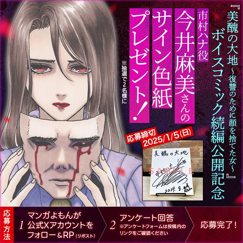 株式会社ぶんか社(本社:東京都千代⽥区、代表取締役:今晴美)が運営する「マンガよもんが」( https://www.yomonga.com/ )にて12/6(金)より『美醜の大地~復讐のために顔を捨てた女~』フェアを開催します。