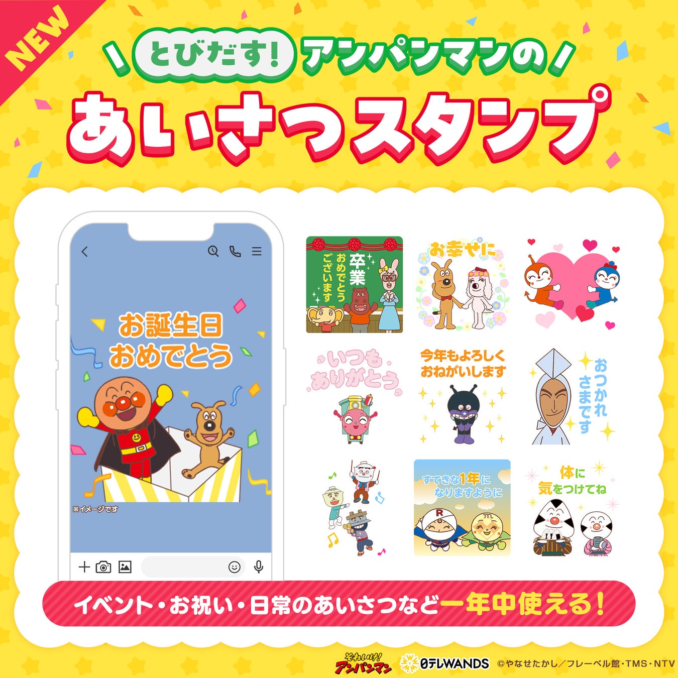 株式会社日テレWands(本社:東京都港区、代表取締役社長:鈴木 重利、以下、日テレWands)は、LINEヤフー株式会社が運営するコミュニケーションアプリ「LINE」内のスタンプショップとLINEの公式オンラインストアLINE STOREにて、LINEスタンプ「飛び出す!アンパンマンのあいさつスタンプ」の配信を開始いたしました。