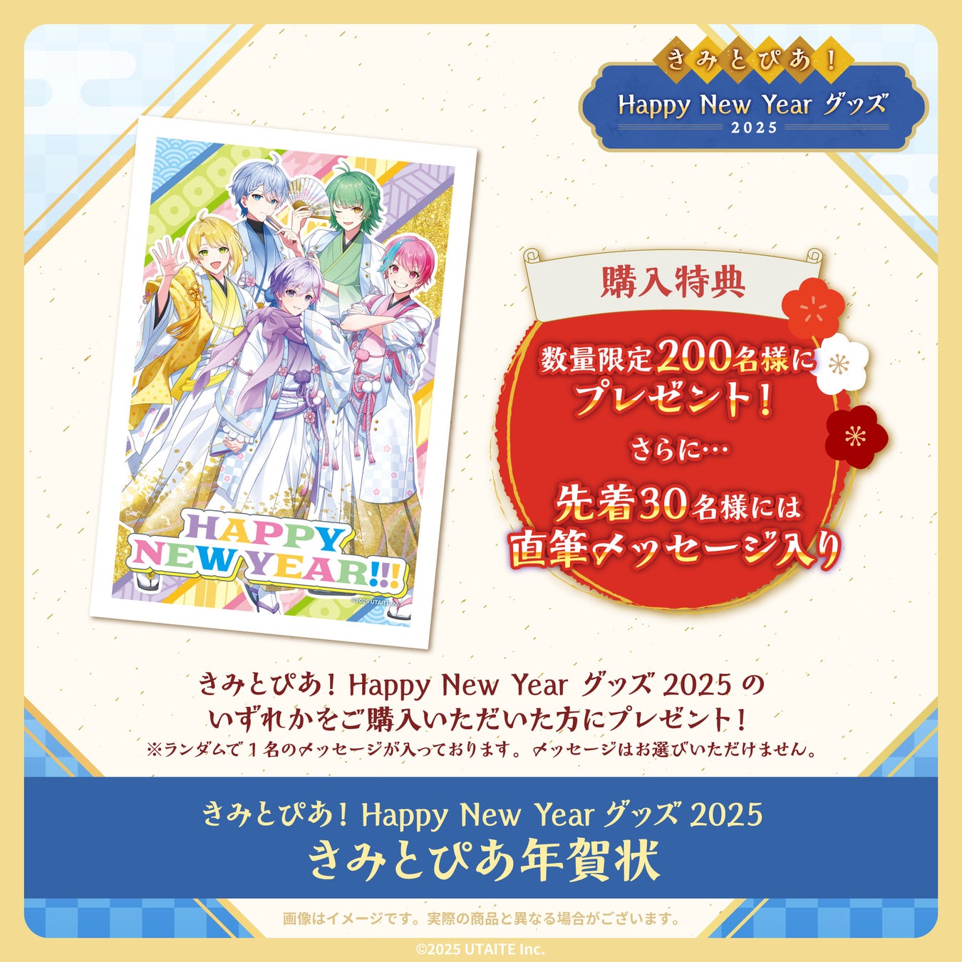 『きみとぴあ!Happy New Year グッズ 2025』をご購入いただいた方のなかから、先着200名様限定で『きみとぴあ年賀状』をプレゼントいたします。さらに、先着30名様にはメンバーの直筆メッセージ入りとなります。