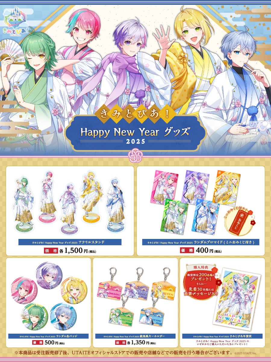 2.5次元IP開発、運営を行う株式会社ウタイテ(本社:東京都新宿区、代表取締役:倉田将志)は2025年1月2日(木)18時より、UTAITEオフィシャルストアにて『きみとぴあ!Happy New Year グッズ 2025』の受注販売を開始することをお知らせいたします。