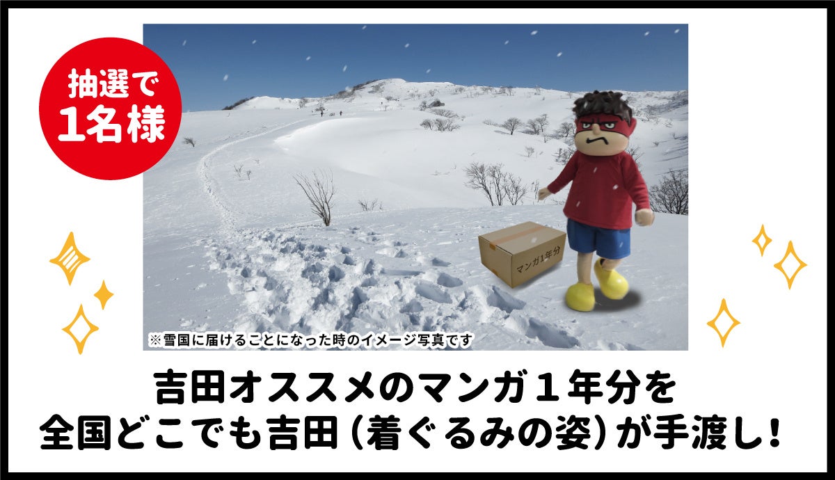 本選手権を色々と盛り上げていきます。その一環として「吉田くんがおすすめするマンガを1年分プレゼント(しかも全国どこでも着ぐるみで手渡し)」などの豪華キャンペーンも実施します。
