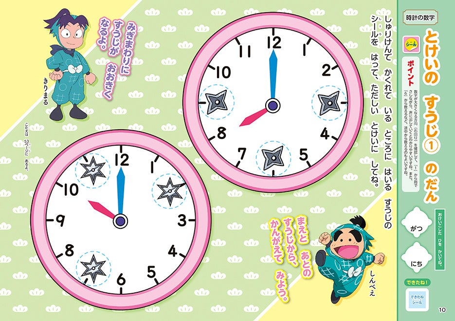 「とけい」は、お子様の成長に合わせて無理なく進められるように、少しずつ難易度が上がっていきます。めいろなど、遊びの要素がいっぱい。