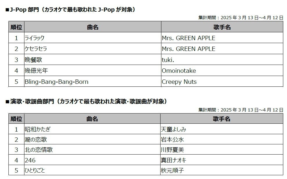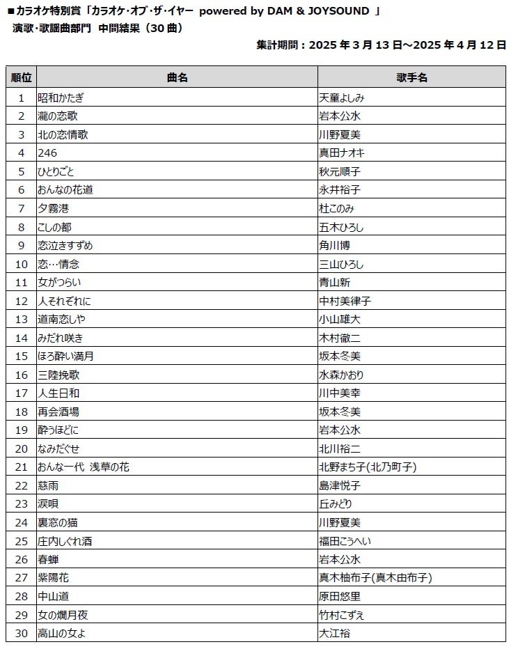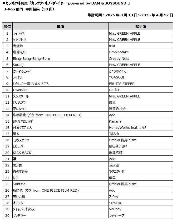 株式会社エクシング(以下、エクシング)と株式会社第一興商(以下、第一興商)は、「MUSIC AWARDS JAPAN」の「共創カテゴリー」におけるカラオケ特別賞「カラオケ・オブ・ザ・イヤー powered by DAM & JOYSOUND」の2025年3月13日から4月12日までの途中経過を発表します。
