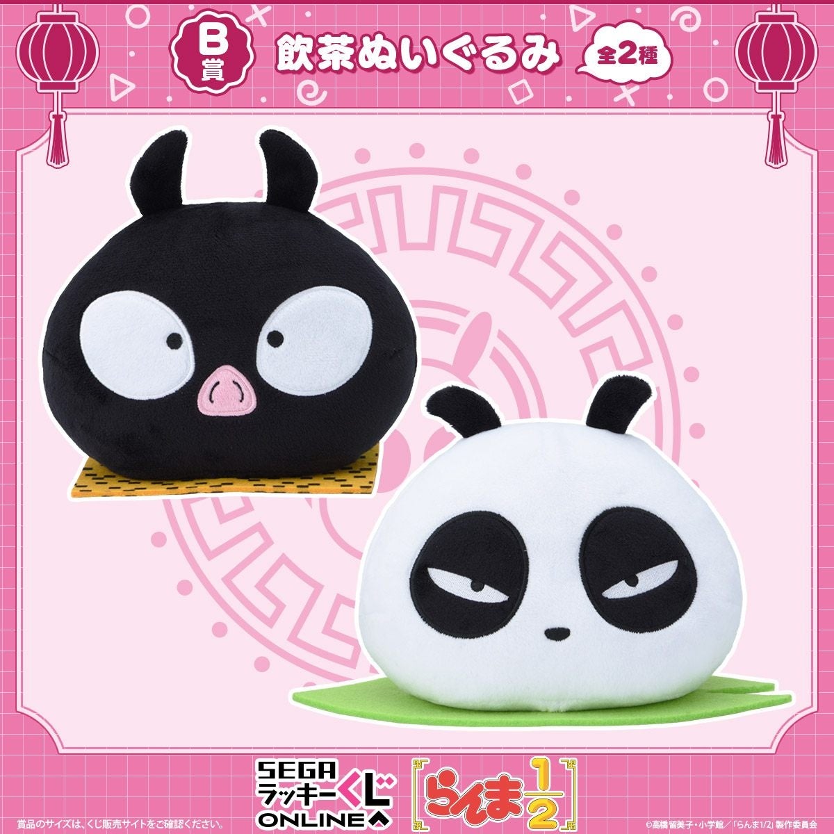 当くじは、“お手伝い”がテーマのTVアニメ「らんま1/2」のセガ限定オンラインくじです。このくじのために中華風エプロンに扮したキャラクターたちの描きおろしイラストをご用意いたしました。描きおろしラストを使用したA賞「クッション」やC賞「アクリルスタンド」のほか、「Pちゃん」「パンダ」のB賞「飲茶ぬいぐるみ」など、豊富なラインナップとなっております。