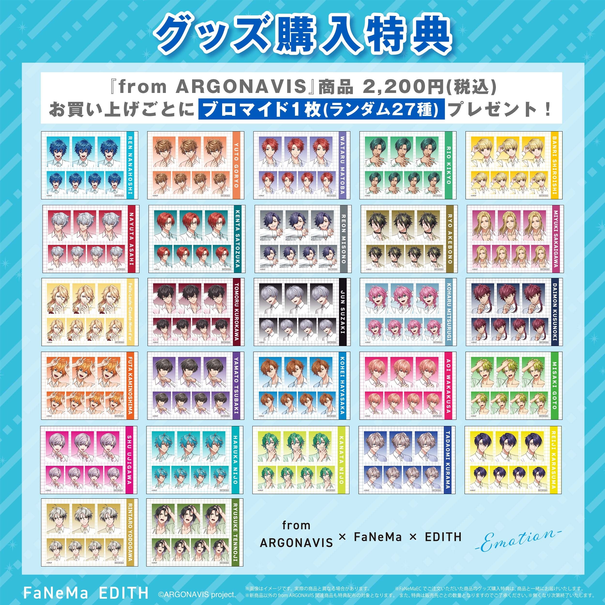 「FaNeMa」、EDITH「E-DINER 池袋本店」、「イーアニ -EDITH ANIME SHOP-」にて「from ARGONAVIS」関連グッズを2,200円(税込)お買い上げ毎に、「ブロマイド」を1枚プレゼントいたします。