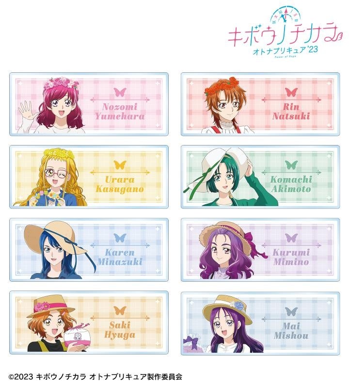 夢原 のぞみ、夏木 りん、春日野 うらら、秋元 こまち、水無月 かれん、美々野 くるみ、日向 咲、美翔 舞の描き下ろしイラストをアクリルネームプレートに仕上げました。