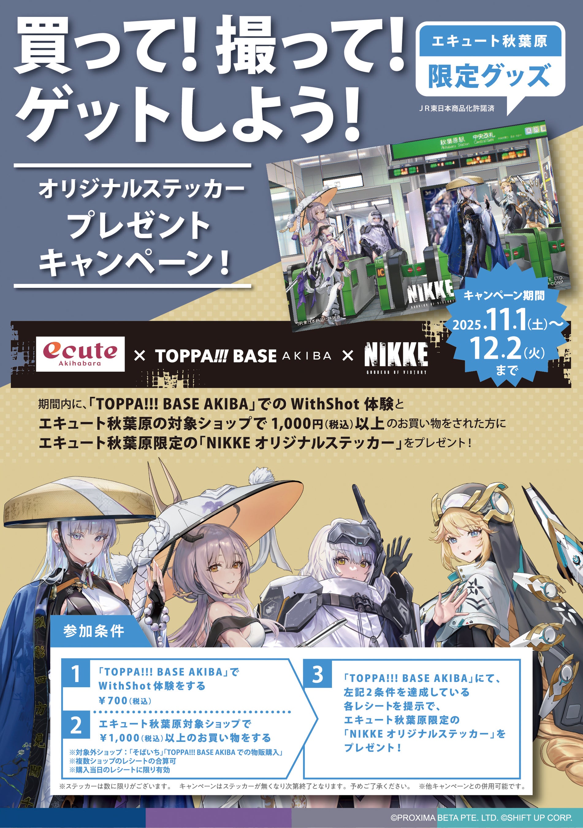 『WithShot®』の撮影体験と、エキュート秋葉原の対象ショップで1,000円(税込)以上のお買い物をされたお客さまに、エキュート秋葉原限定の「NIKKEオリジナルステッカー(数量限定・なくなり次第終了)」をプレゼントいたします。NIKKEのキャラクターがJR秋葉原駅を訪れたワンシーンを描いたステッカーデザインは、このコラボレーションのために描き下ろしたエキュート秋葉原限定のデザインです。また、AR技術を活用した『WithShot®』のデジタルフォトブースでは、NIKKEのキャラクターがまるでその場にいるかのような写真が撮影でき、エキュート秋葉原だけの臨場感ある撮影体験が楽しめます。新技術の体験とエキュート秋葉原を回遊するお買い物で、ここだけのステッカーをゲットできる特別なキャンペーンをお楽しみください。エキナカの“ちょっとミライ”が行き交う、次世代型商業施設「エキュート秋葉原」の今後の取り組みにもご注目ください。