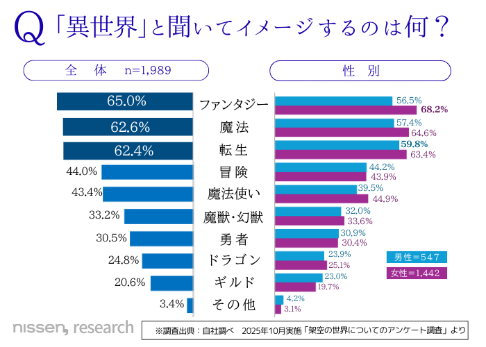 ・「異世界」で思い浮かべるのは“ファンタジー”“魔法”“転生”がTOP3。性別でみると、女性は