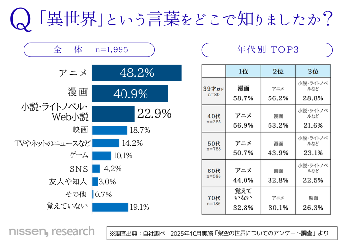 「異世界」を知ったきっかけとしては「アニメ」「漫画」「小説・ライトノベル」が上位を占め、60代以上でも“テレビやネットニュースよりアニメで知った”という回答が多く見られました。今や「異世界」はメディア横断的に共有される文化となりつつあります。