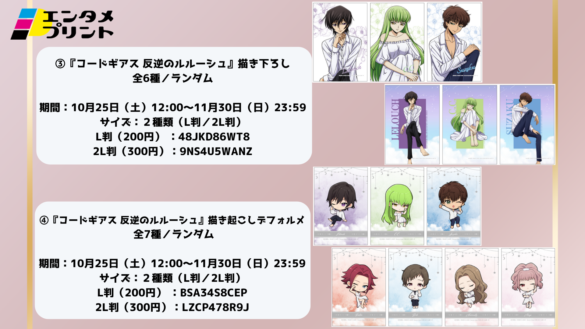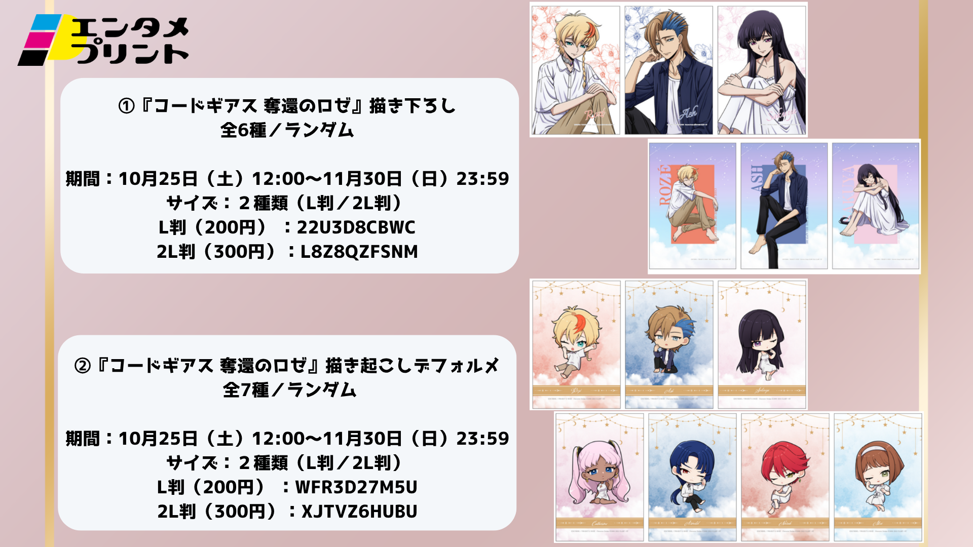 株式会社イード(本社:東京都中野区、代表取締役:宮川 洋)は、「エンタメプリント」の新コンテンツとして、株式会社エテルノレシ(本社:千葉県野田市、代表取締役:伊藤 学)による、アニメ『コードギアス 奪還のロゼ』&『コードギアス 反逆のルルーシュ』の描き下ろしイラストグッズを販売したPOP UP STOREの開催に合わせて、ランダムブロマイドを10月25日(土)正午より販売開始しました。