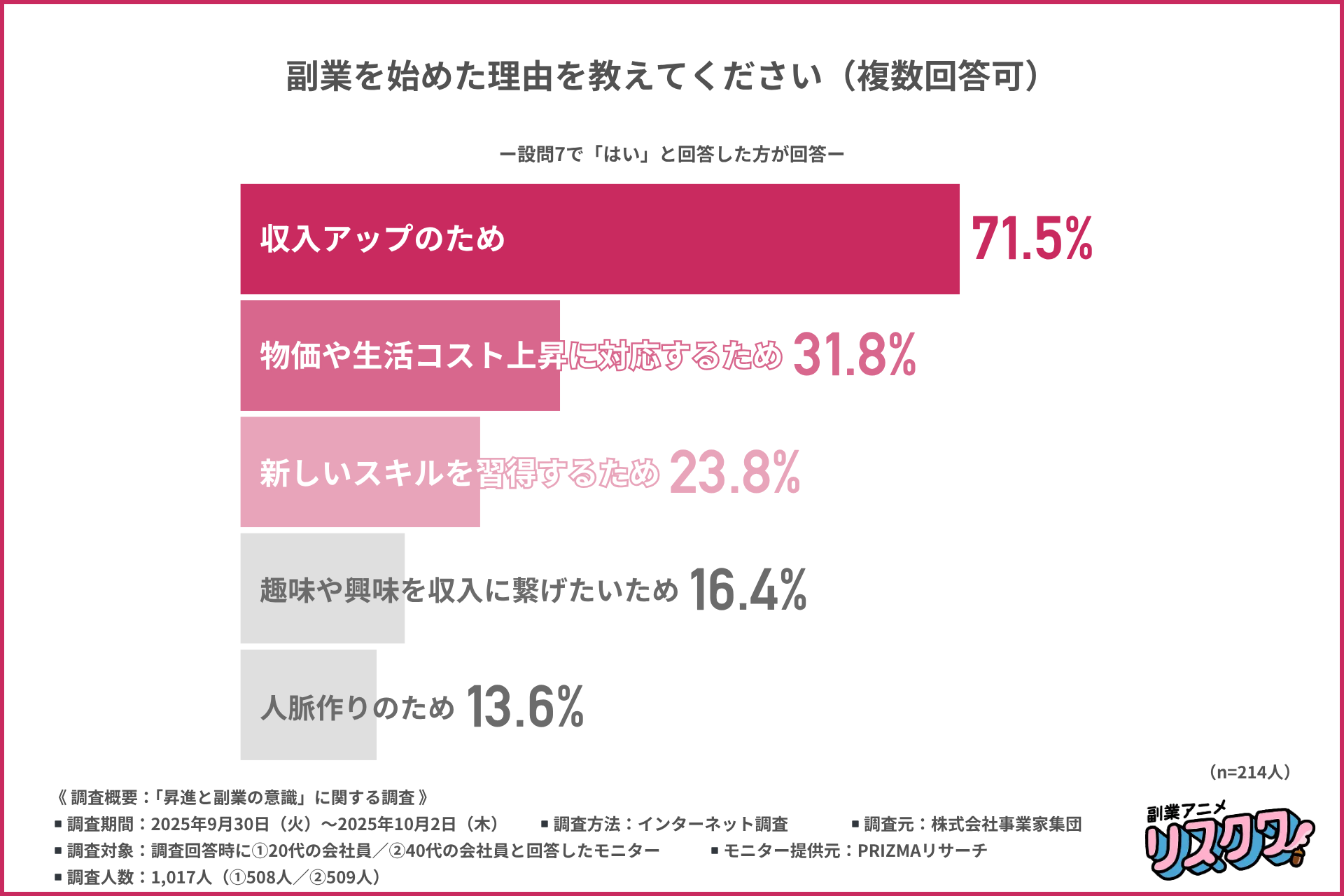 副業を始めた理由としては「収入アップ」が突出して多く、「物価上昇への対応」や「スキル習得」も続きました。