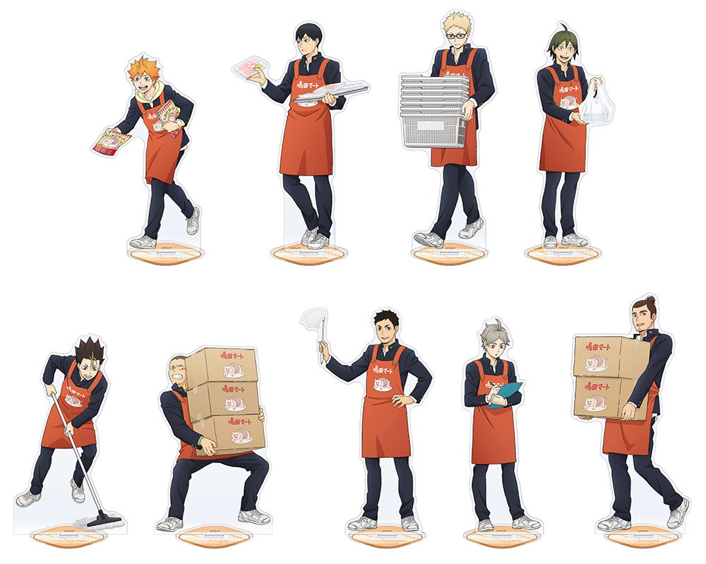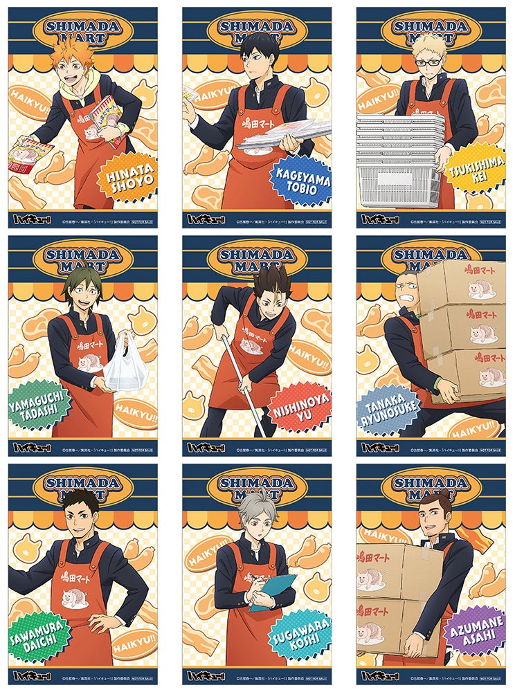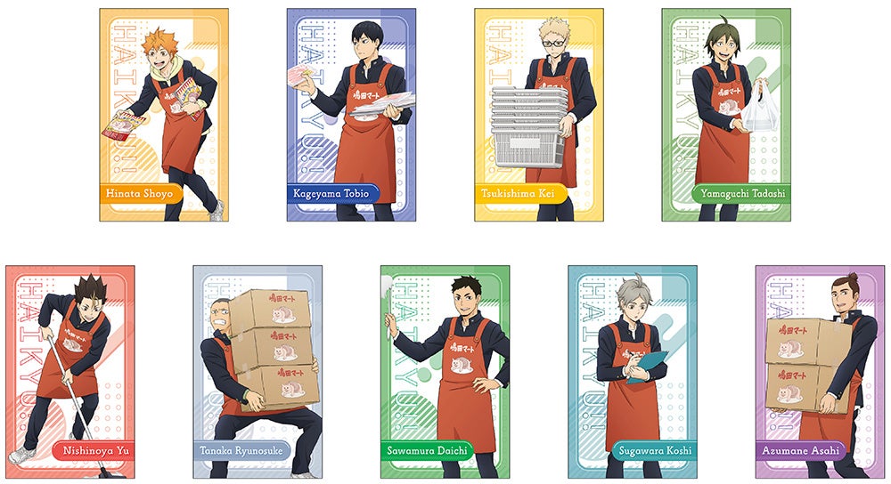 「嶋田マートで職業体験」がテーマの描き下ろしビジュアルを使用した、烏野高校排球部のメンバー9人の新商品が登場! 「アクリルスタンド」や「カードセレクション」をラインナップするほか、普段使いしやすい「エコバッグ」などの多数のグッズを発売いたします。