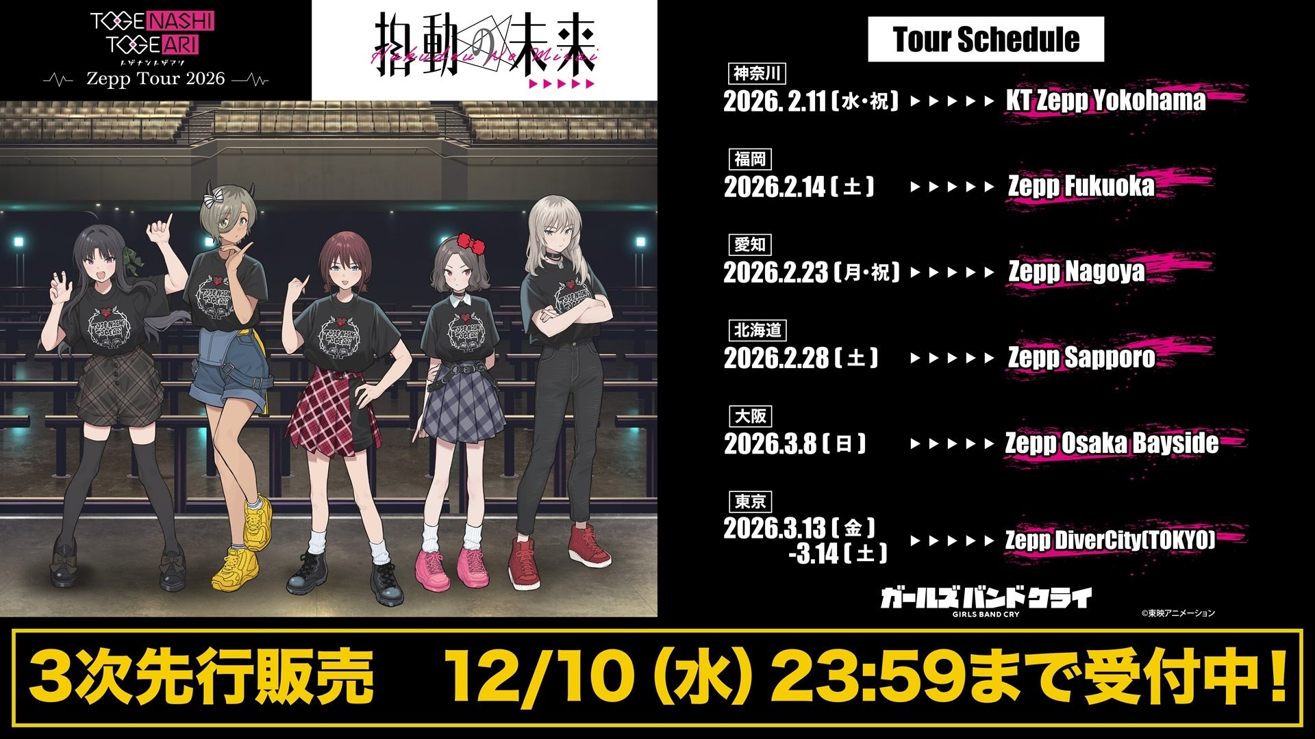 トゲナシトゲアリ Zepp Tour 2026 “拍動の未来”が、2026年2月11日(水・祝) にKT Zepp Yokohamaを皮切りに全国6都市で開催されます。現在、チケット3次先行抽選販売が受付中です。