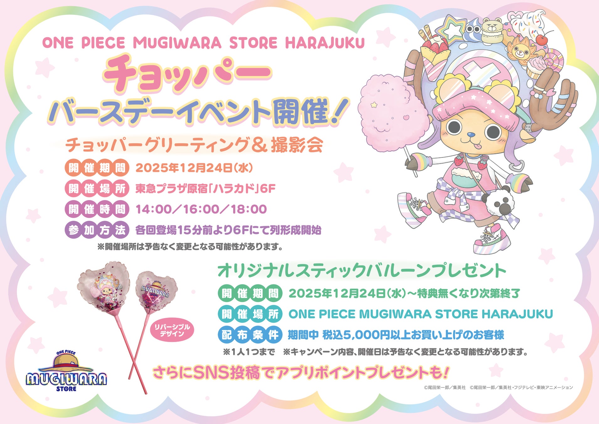 12月24日(水)から「ONE PIECE MUGIWARA STORE HARAJUKU」で3,000円(税込)以上購入すると、ここでしか手に入らないHARAJUKU CHOPPERデザインのオリジナルスティックバルーン(全1種)を1つプレゼント!