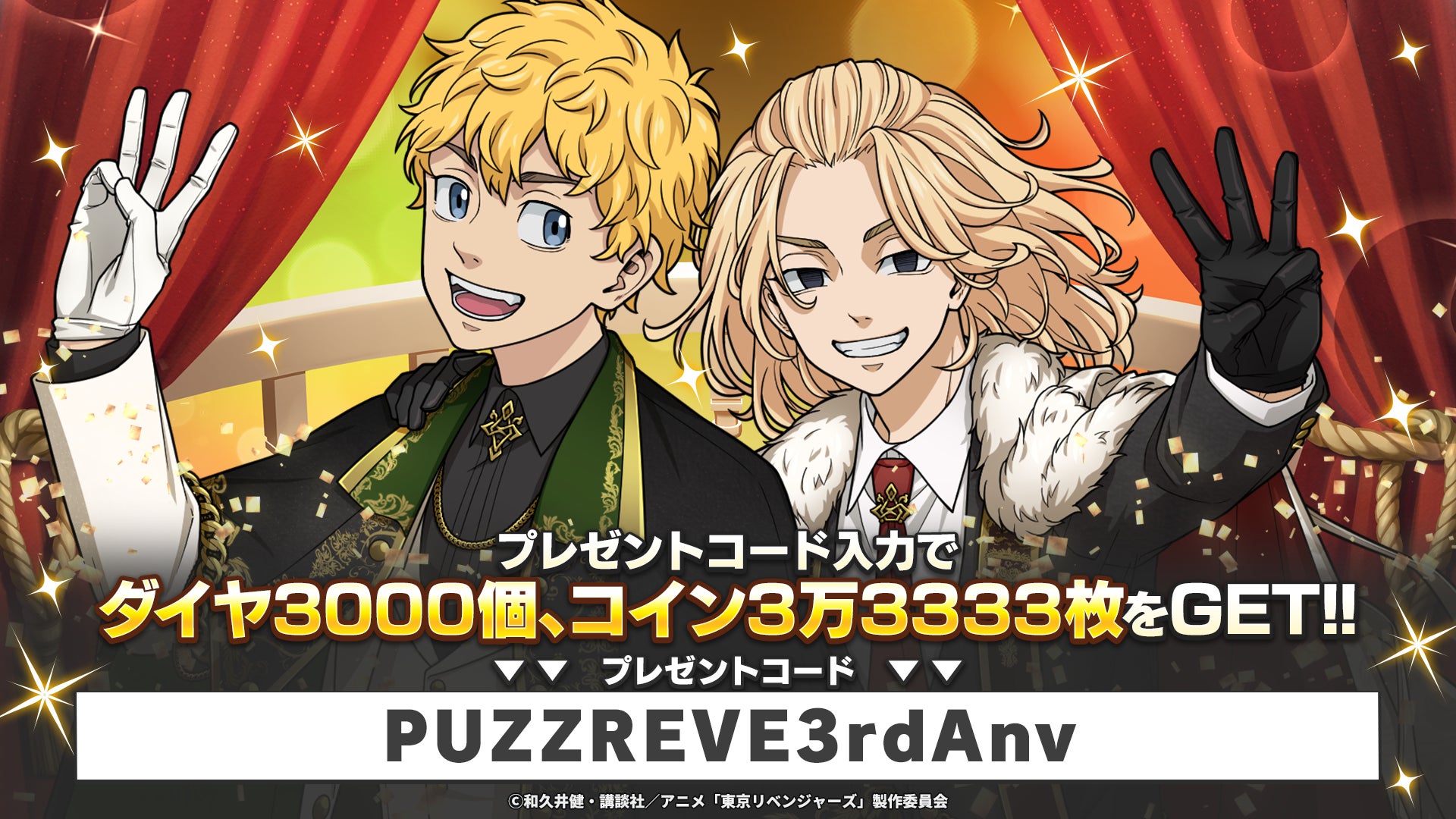 プレゼントコード「PUZZREVE3rdAnv」を入力することで、ダイヤ3000個とコイン3万3333枚をGETすることができます!