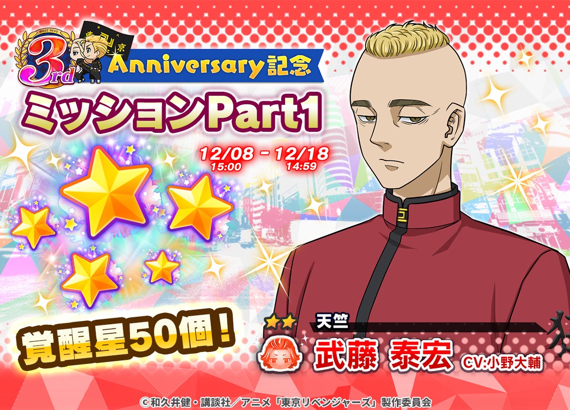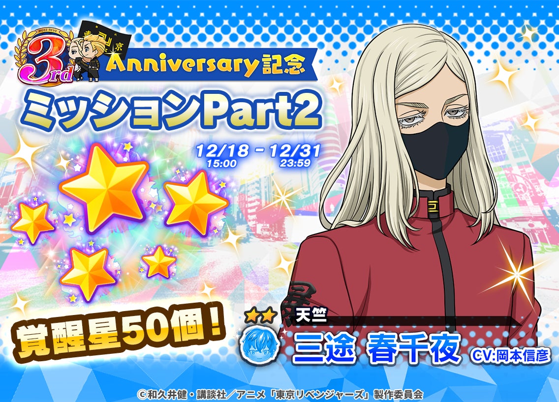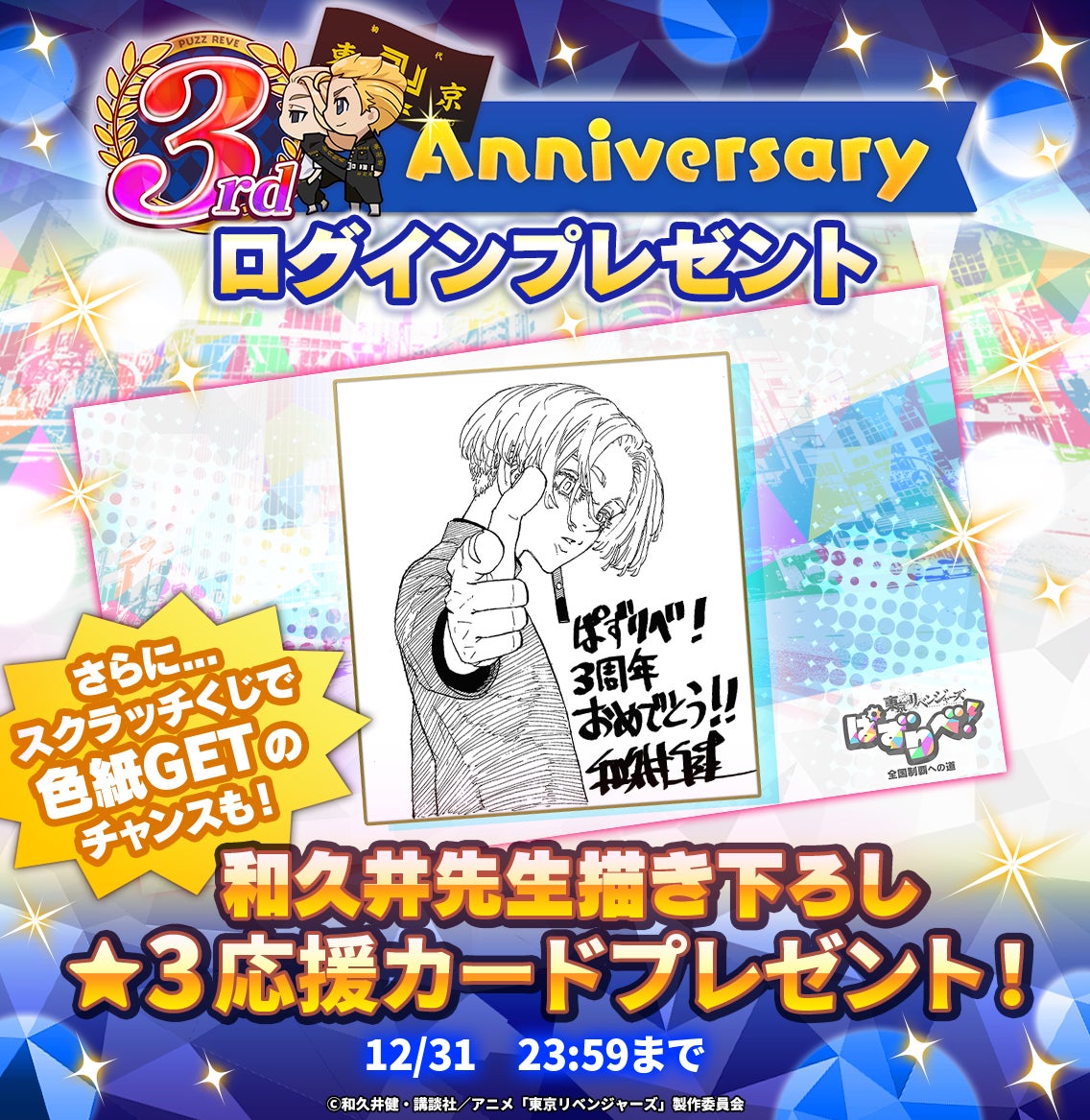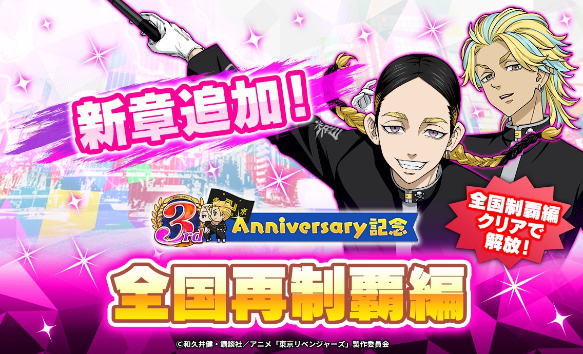 株式会社GOODROID(本社:東京都目黒区、代表取締役社長:松田和彬)は、株式会社講談社(東京都文京区、代表取締役社長:野間省伸)と株式会社ポニーキャニオン(東京都港区、代表取締役社長:大熊一成)と共同で企画制作を行う漫画やアニメで人気の『東京リベンジャーズ』 のスマートフォン向けゲームアプリ『東京リベンジャーズ』 のスマートフォン向けゲームアプリ『東京リベンジャーズ ぱずりべ! 全国覇への道』(以下、『ぱずりべ』)で、12月8日(月)15時より3周年キャンペーンを開始いたしました。