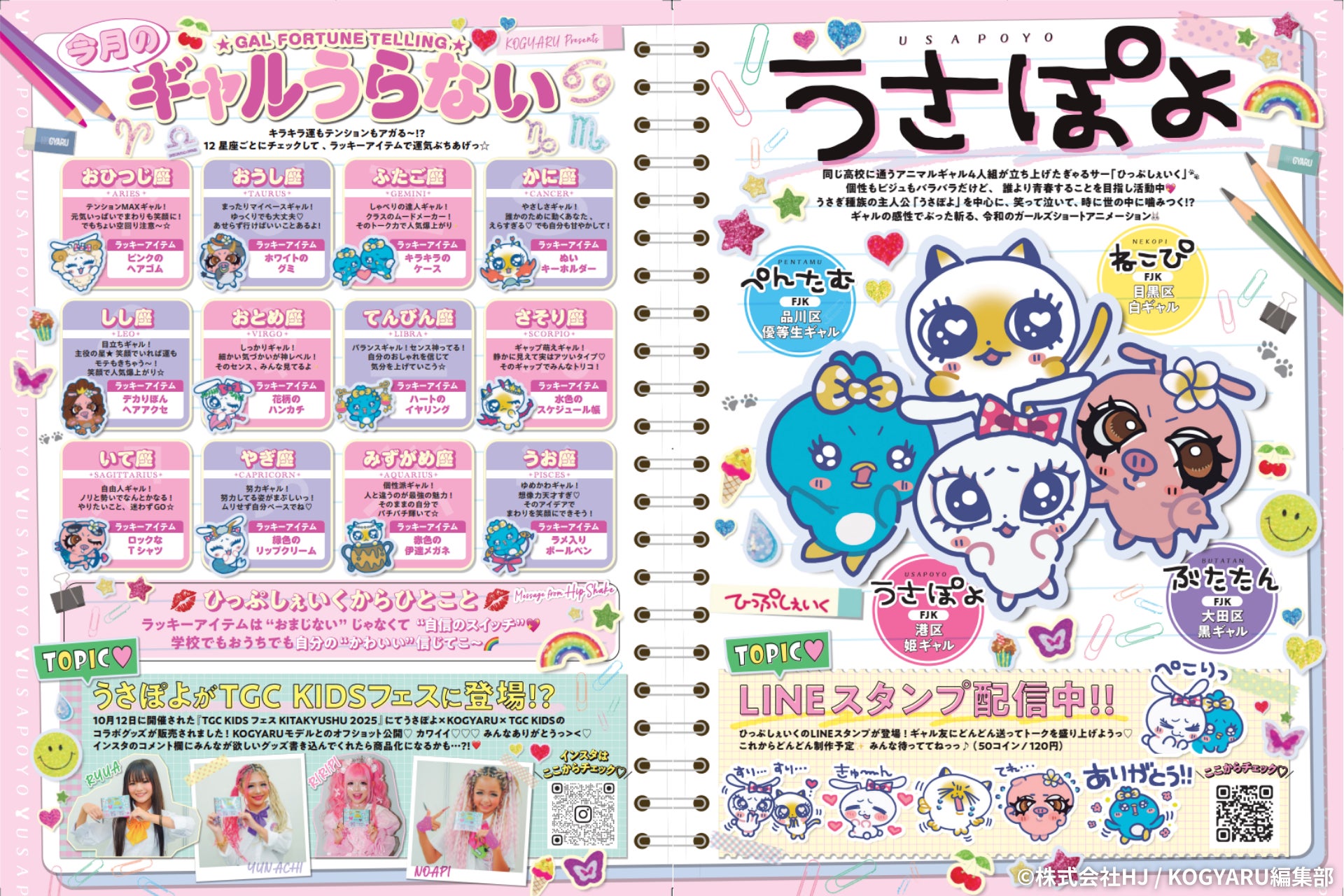 「うさぽよ」は、小学生ギャル雑誌「KOGYARU」とのコラボレーションを実施し、雑誌の一面にも取り上げられた。また、KOGYARUメンバーが声優を担当したアニメーションを公式SNSにて「心に響くうさぽよたちのギャルマインド」や、最新のコラボレーション情報を配信中です。コラボアニメは毎週水曜日・金曜日に配信しており、キャラクターへの注目度が急上昇しています。