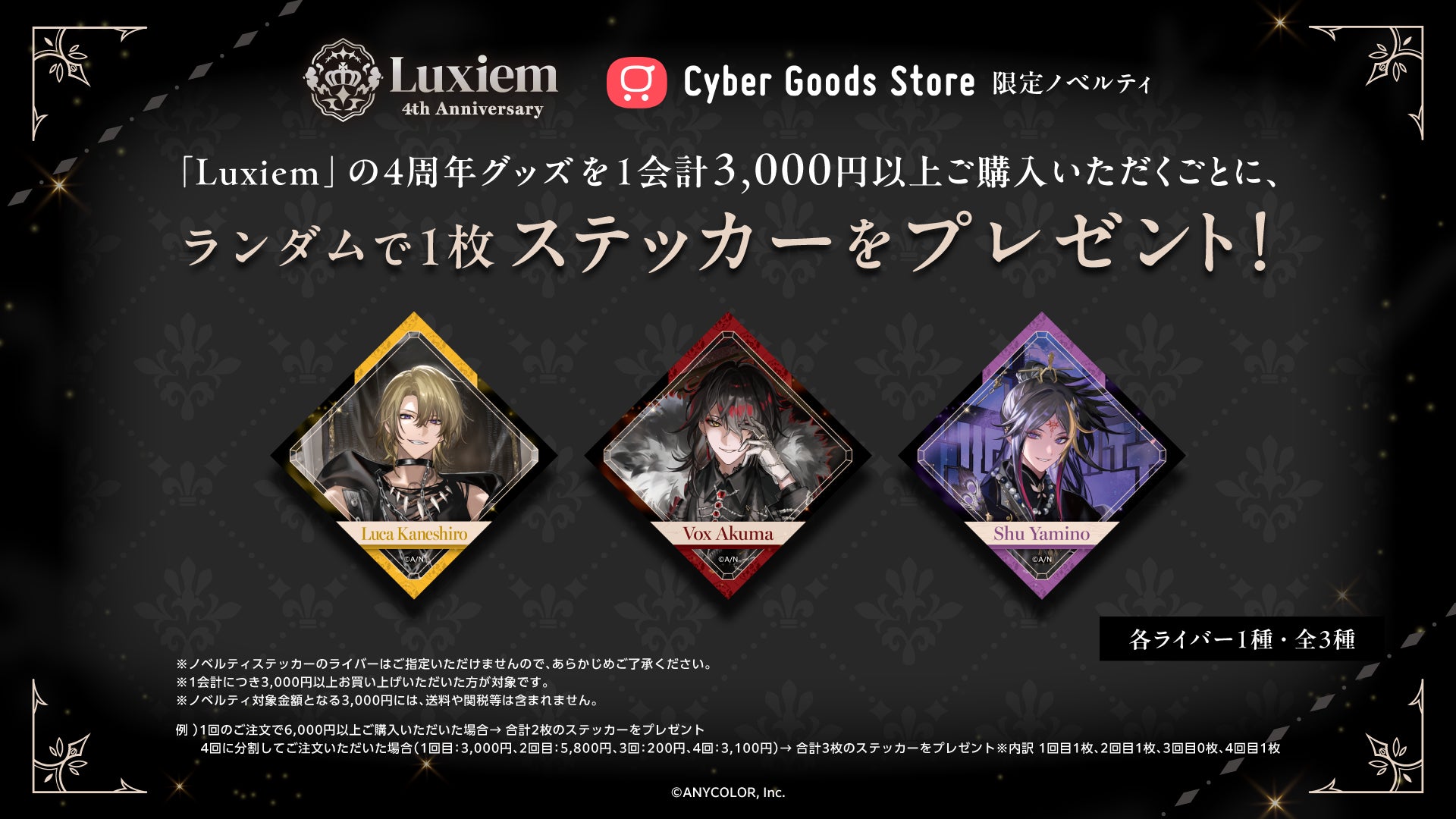 Cyber Goods Storeにて「Luxiem」4周年記念グッズを1会計3,000円以上ご購入いただくごとに、ランダムで1枚ステッカー(全3種)をプレゼントいたします。
