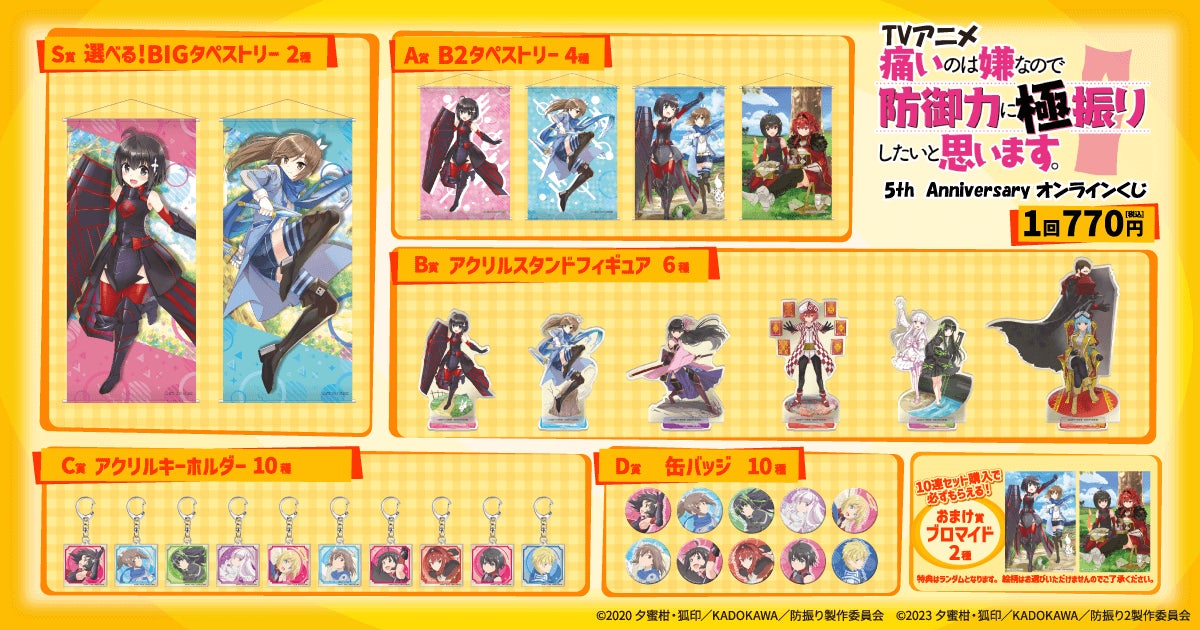 株式会社KADOKAWA(本社:東京都千代田区、取締役 代表執行役社長 CEO:夏野 剛、以下 KADOKAWA)は、運営するオンラインくじサービス「くじ引き堂」において、TVアニメ『痛いのは嫌なので防御力に極振りしたいと思います。』の豪華賞品が手に入る<TVアニメ 痛いのは嫌なので防御力に極振りしたいと思います。5th Anniversary オンラインくじ>を、2025年12月16日(火)12時より販売します。