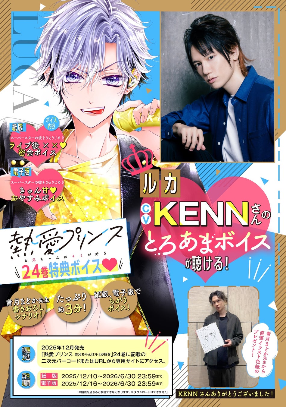 『熱愛プリンス お兄ちゃんはキミが好き』24巻(紙版)の本文内にある二次元バーコードかURLで専用サイトにアクセスすると、KENNさんが演じるルカの「とろあまボイス」が聴けます。