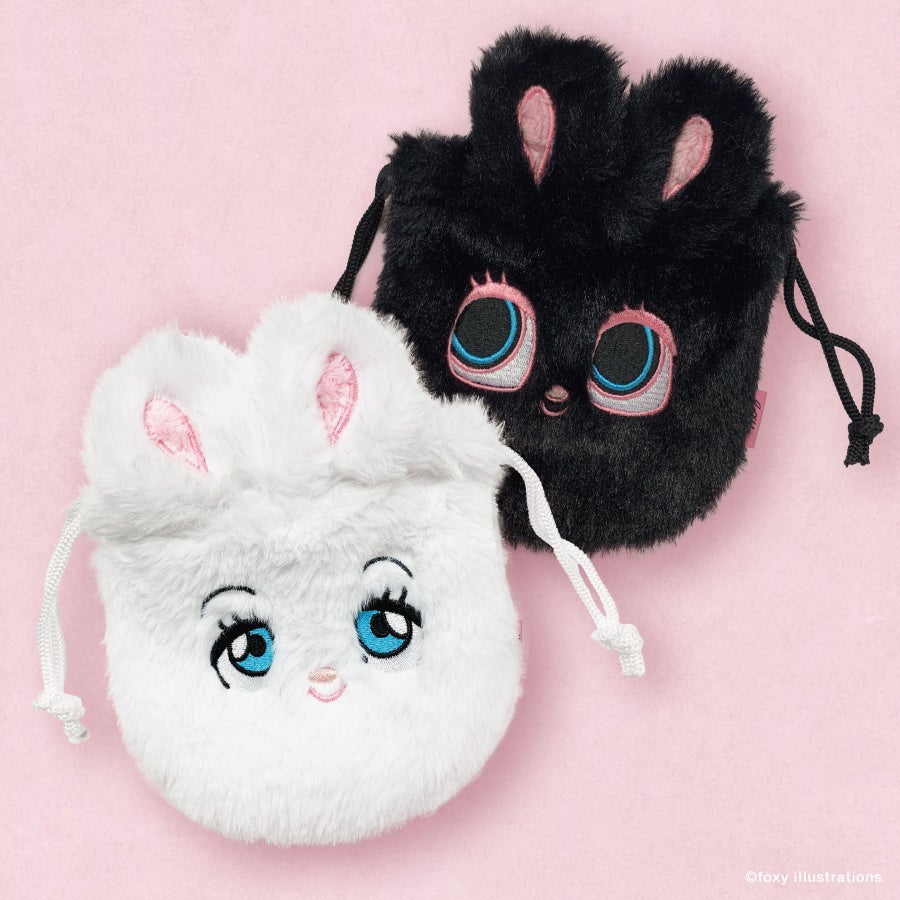 バニーとブラックバニーのフェイス巾着です!ふわふわ素材で、口を絞ると顔の形になります♡