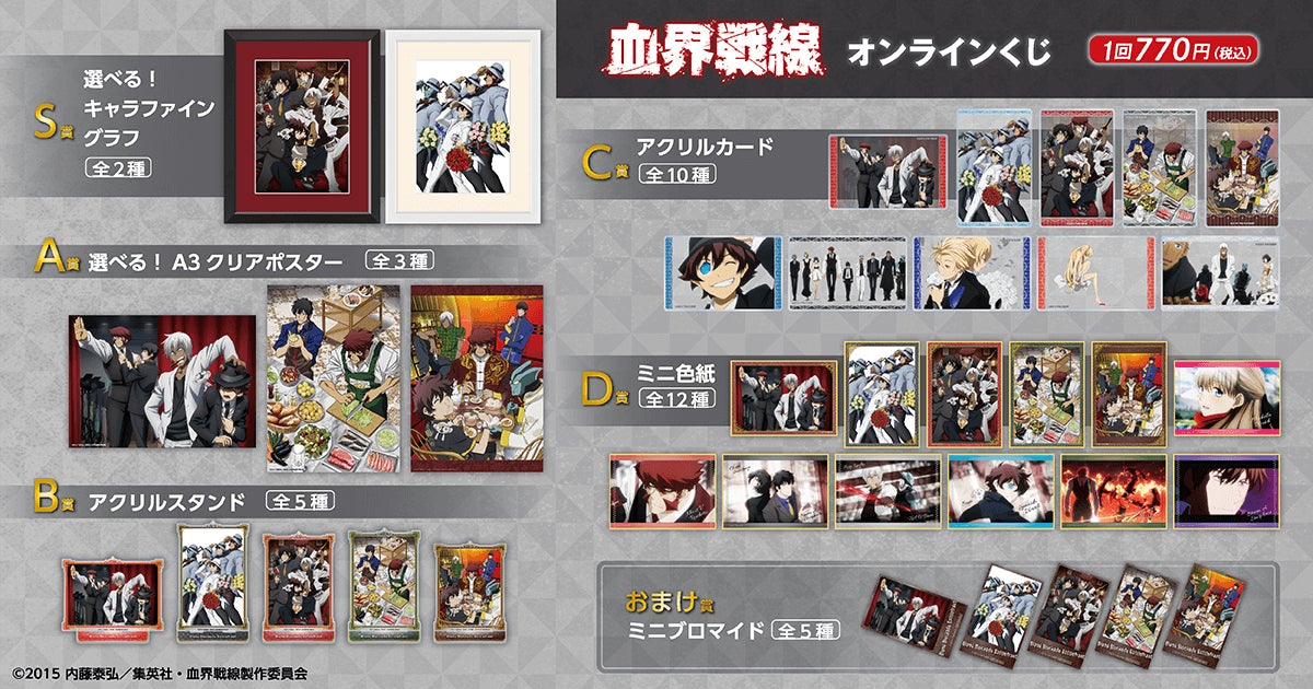 今年アニメ放送10周年を迎えました「血界戦線」。記念企画として、当時の雑誌用イラストや場面写を使用した豪華賞品が登場です!作中の思い出のシーンを集めた賞品などファン必携のアイテムが盛りだくさん!この機会をお見逃しなく!!