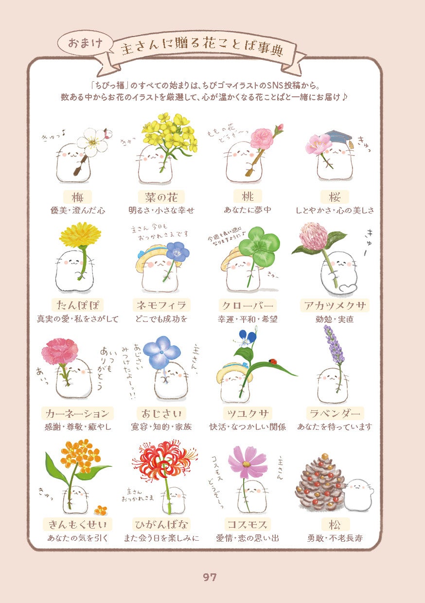 さらに、ちびゴマのイラストで贈る「花ことば事典」や、にぎやかなお祭りが舞台の「まちがいさがし」、質問に答えるだけで自分と相性の良いちびっ福がわかっちゃう「マッチングチャート」など、遊び心満載のおまけページを用意しました。一冊のはじめからおわりまで、幸せを詰め込んでいます◎