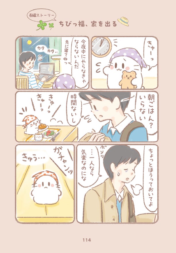 頑張りすぎた結果、心の余裕を失う主さんたち。ちびっ福を冷たく突き放してしまう場面から始まる、著者初の長編ストーリー「ちびっ福、家を出る」(全12ページ)を巻末に収録しました。