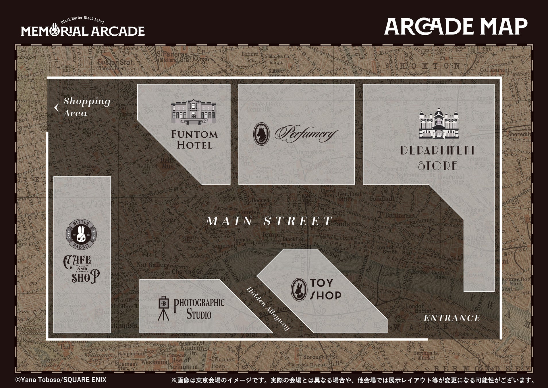 「黒執事 Black Label Memorial Arcade」の会場は、「黒執事 Black Label」がこれまで描いてきた世界観を楽しめる街並みをイメージ。