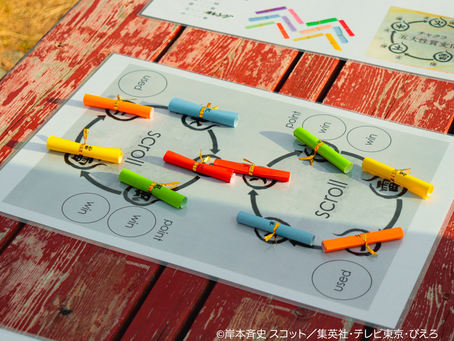 参加者は互いに5つの性質「火」「水」「土」「雷」「風」の巻物を手札に持ち、掛け声とともに術を発動。性質の優劣で勝敗を決めるバトルを複数回行います。