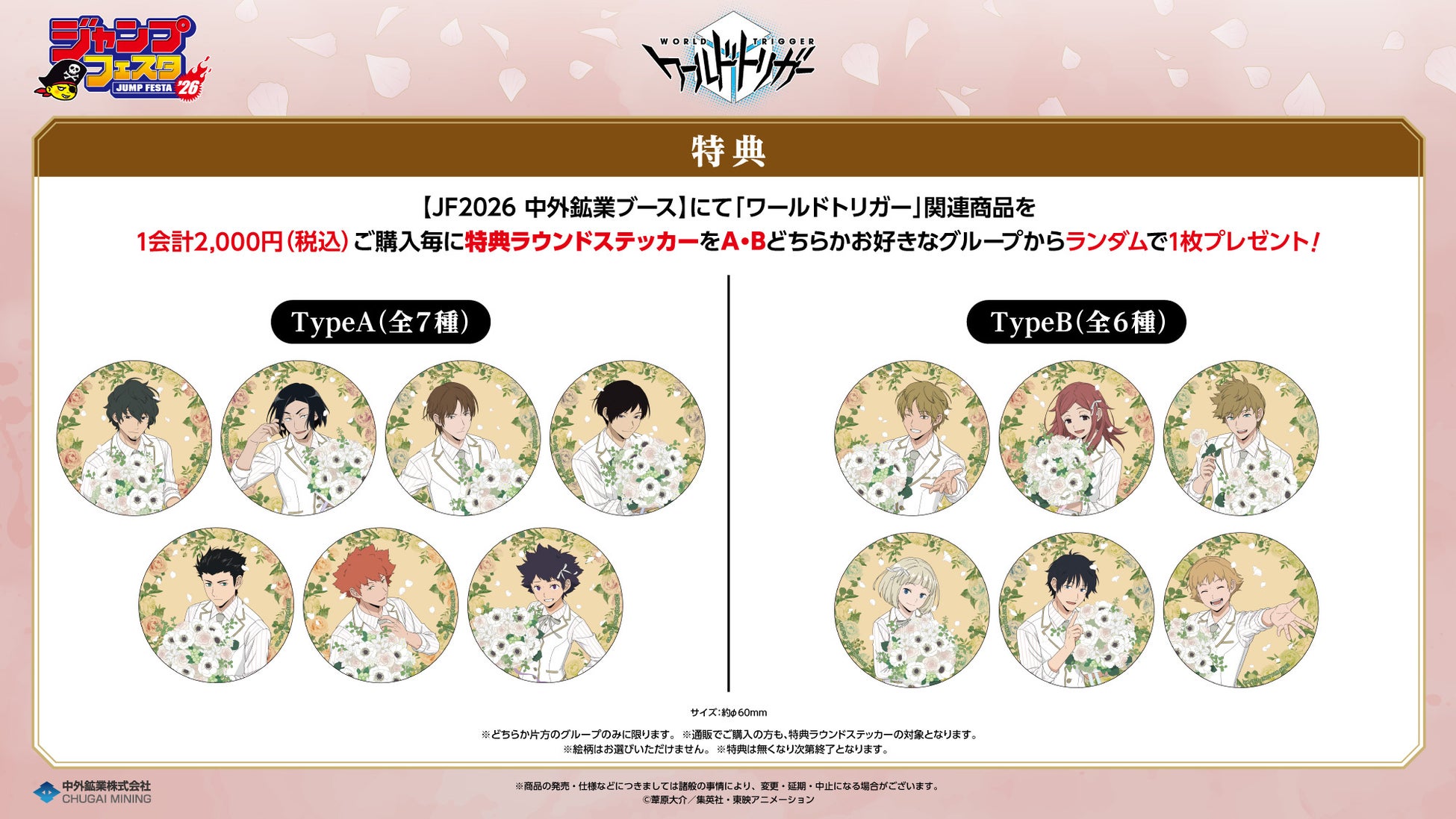 中外鉱業ブースにてTVアニメ『ワールドトリガー』JF2026関連商品を1会計2,000円(税込)ご購入毎に、特典ラウンドステッカーをA(全7種)・B(全6種)どちらかお好きなグループからランダムで1枚お渡しいたします!