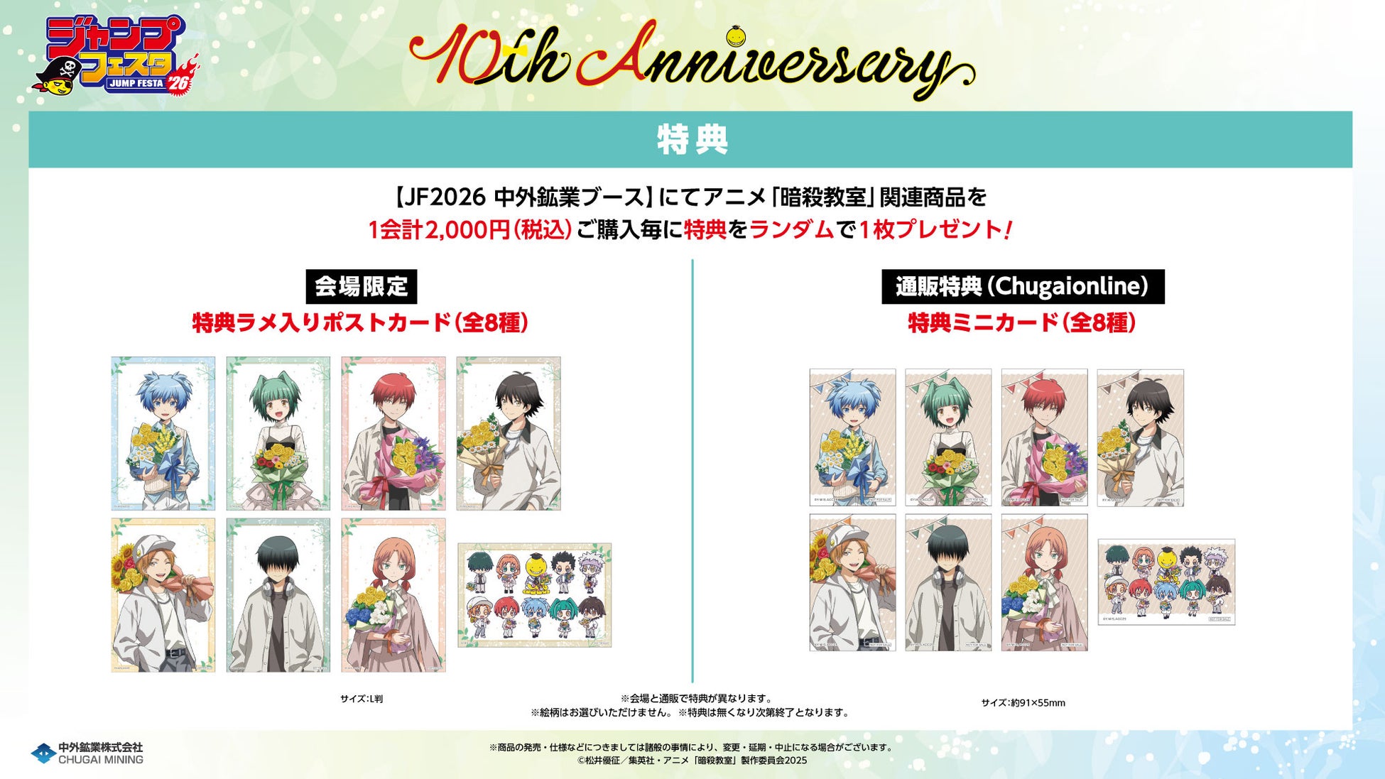 中外鉱業ブースにてアニメ『暗殺教室』JF2026関連商品を1会計2,000円(税込)ご購入毎に、特典ラメ入りポストカード(全8種)をランダムで1枚お渡しいたします!