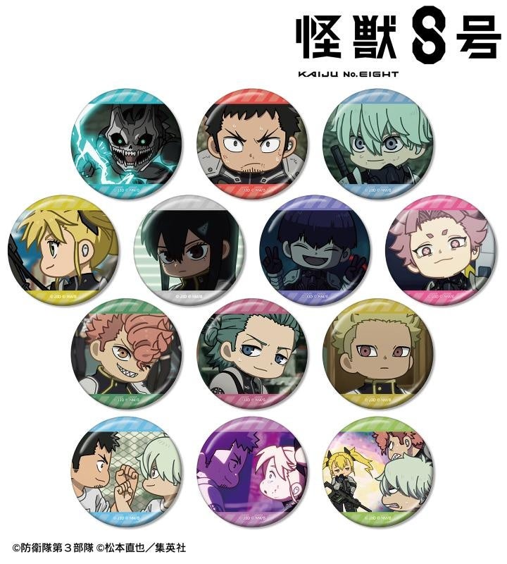 怪獣8号、日比野カフカ、市川レノ、四ノ宮キコル、亜白ミナ、保科宗四郎、鳴海弦、古橋伊春、出雲ハルイチ、神楽木葵の印象的なシーンをそのままデフォルメで再現し、3WAY缶バッジに仕上げました。