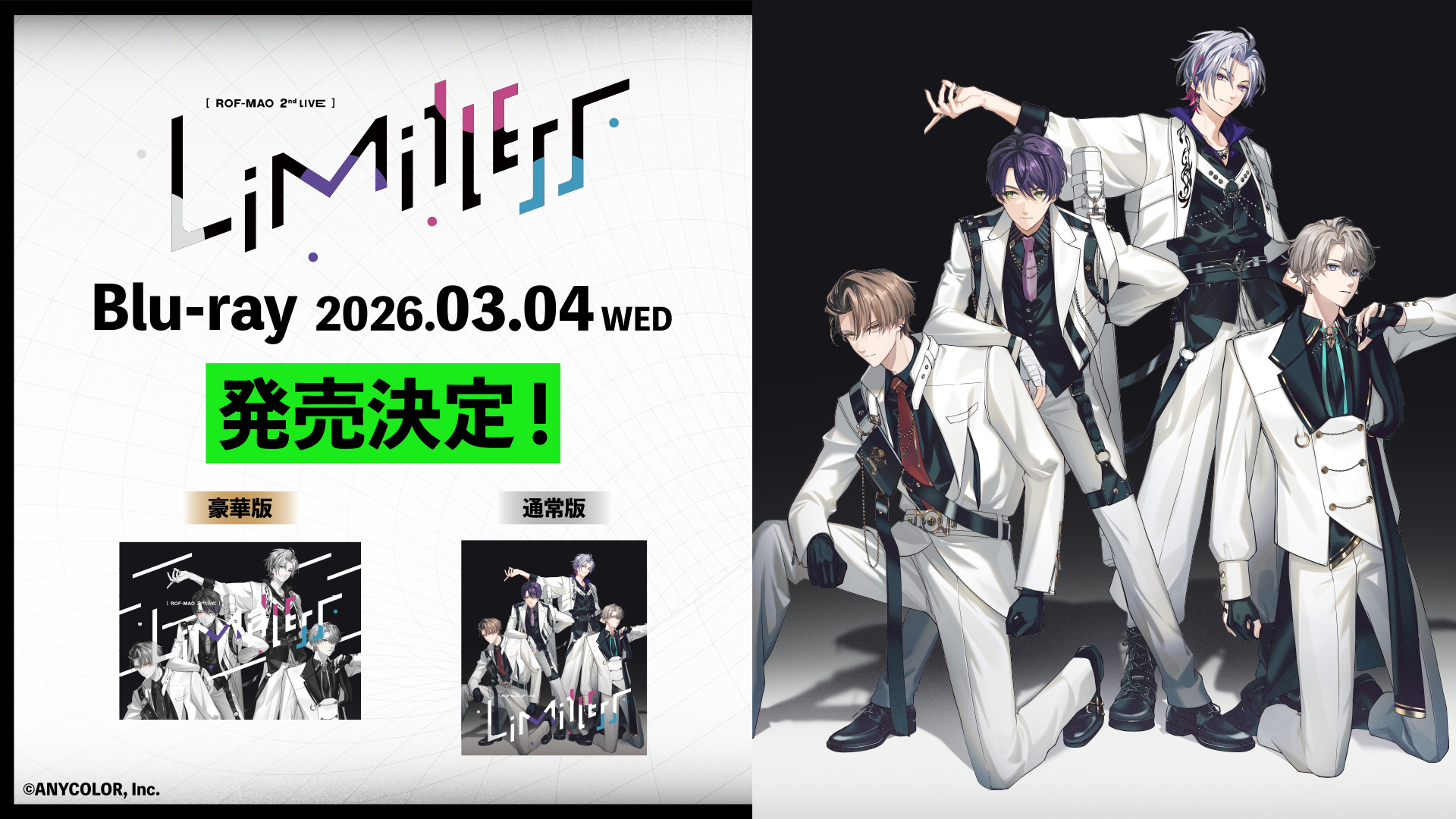 ANYCOLOR株式会社(本社:東京都港区 代表取締役:田角陸、以下「当社」)が運営するVTuber/バーチャルライバーグループ「にじさんじ」所属の加賀美ハヤト/剣持刀也/不破湊/甲斐田晴の4名が集った男性VTuberユニット「ROF-MAO」による、『ROF-MAO 2nd LIVE – Limitless』を収録したBlu-rayを2026年3月4日(水)に発売いたします。