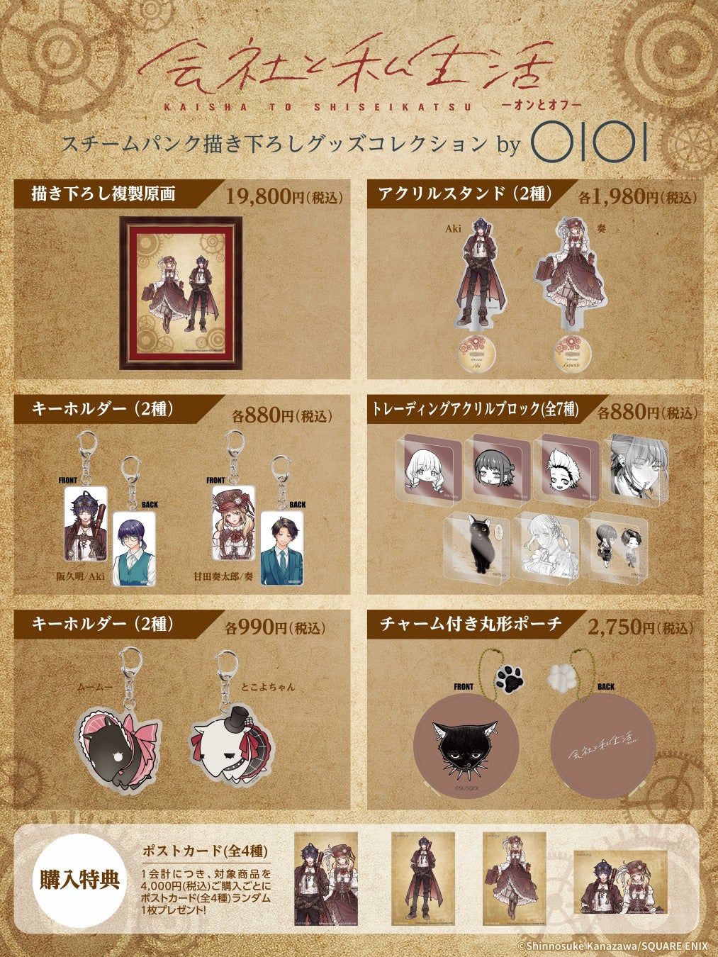 本イベントでは漫画『会社と私生活-オンとオフ-』のコミックイラストを使用したキーホルダー、アクリルブロック、チャーム付きポーチをラインナップ。作品に登場するキャラクターグッズを再現したムームーととこよちゃんのキーホルダーも展開。さらに、コラボを記念して金沢先生によるスチームパンクビジュアルの描きおろしイラストが実現!ここでしか手に入らないアクリルスタンド、額装までこだわった複製原画、裏表で楽しめるキーホルダーはお見逃しなく!