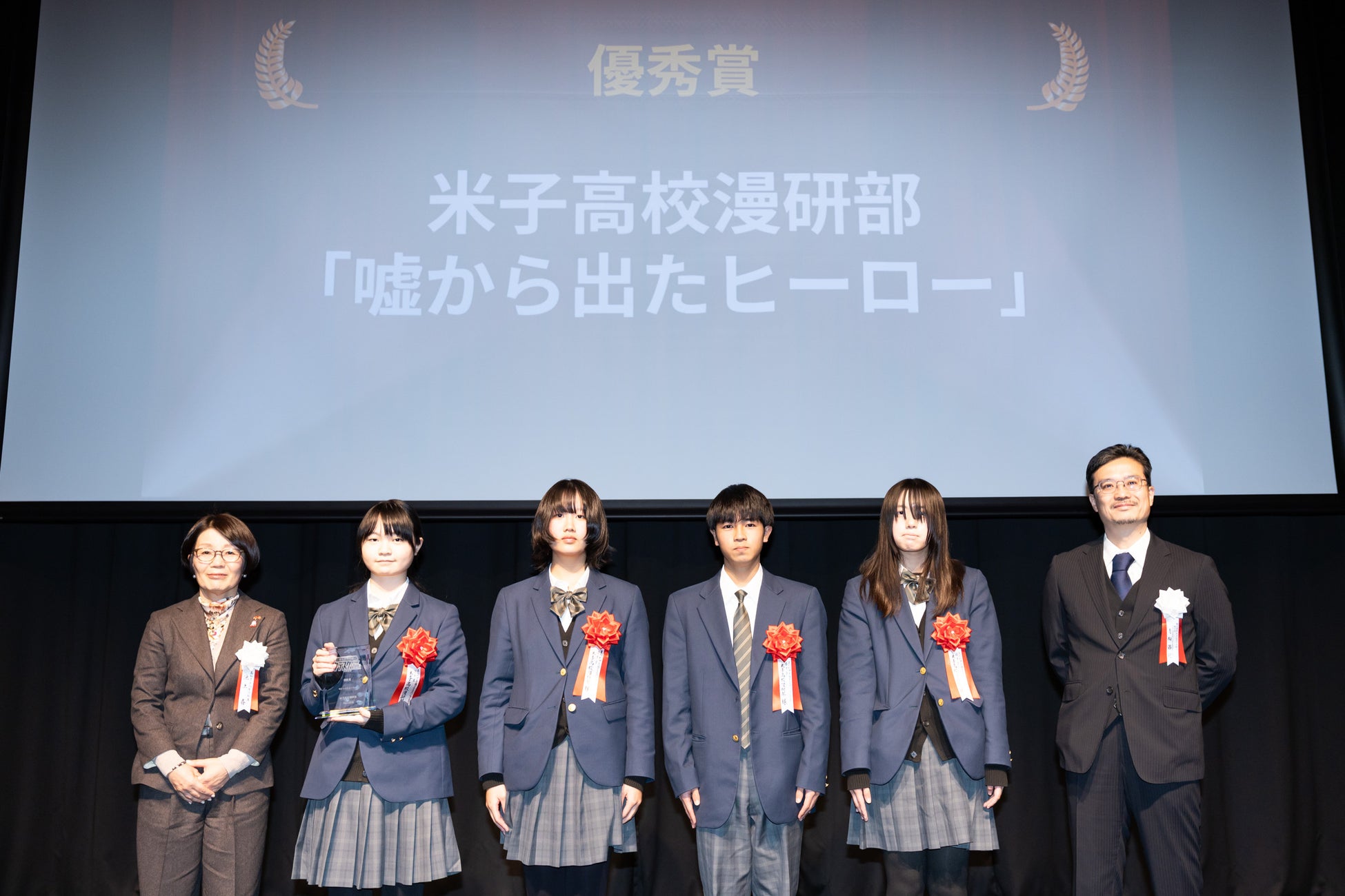 授賞式では、「第5回オールKADOKAWAによるタテスクコミック大賞」受賞者の表彰に続き、初開催となる「まんが甲子園タテスクバージョン2025」の受賞者である高校生たちが登壇し、賞状や盾、目録を授与されました。