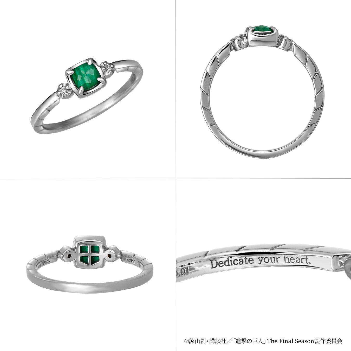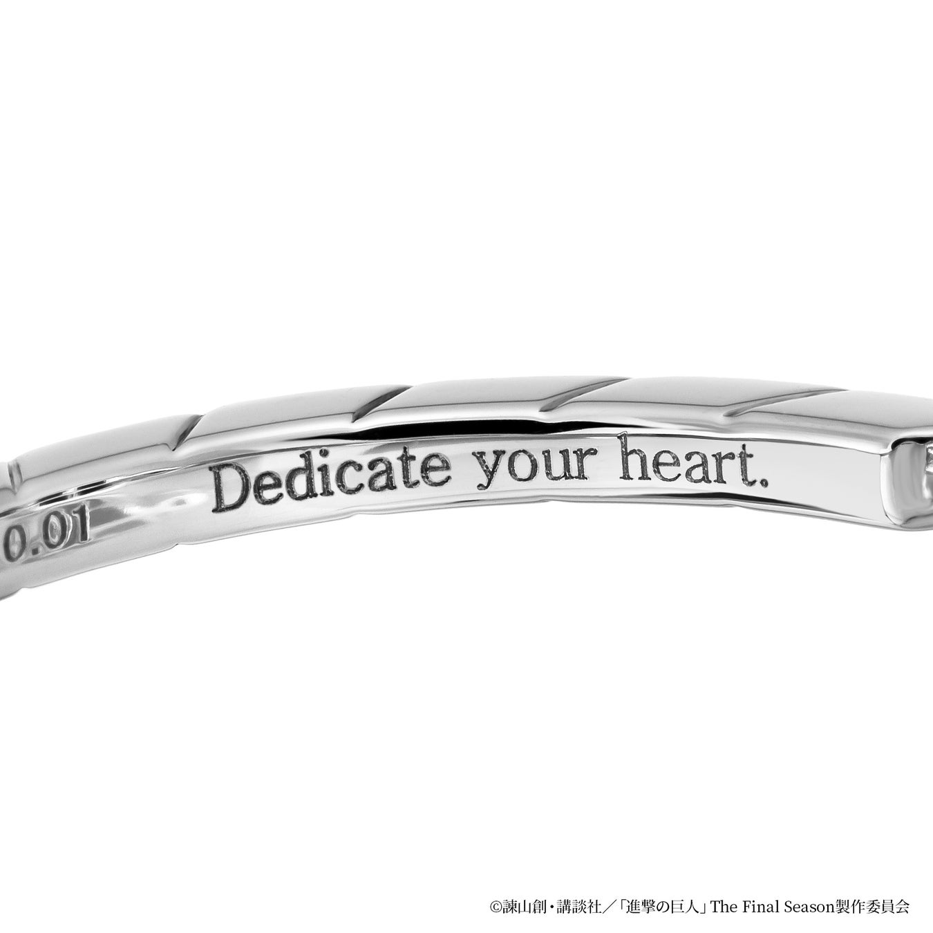 リングの内側には“Dedicate your heart.(心臓を捧げよ)”のメッセージがさりげなく刻印されており、リヴァイ兵士長や物語の世界観をいつも近くに感じて頂けます。高品位なプラチナ950を使用し、末長くご愛用していただけるジュエリーに仕上げました。