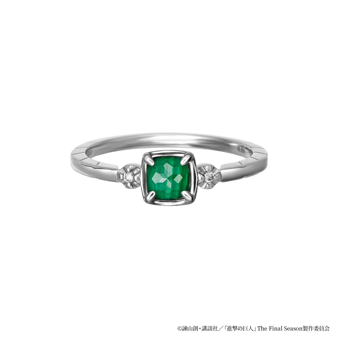 身に纏うグリーンのマントをイメージしたマラカイト(12月誕生石)にジュビリーカットのホワイトクォーツを重ねたオリジナルストーンを使用。仲間や部下を先導するリヴァイ兵士長の姿を重ねました。