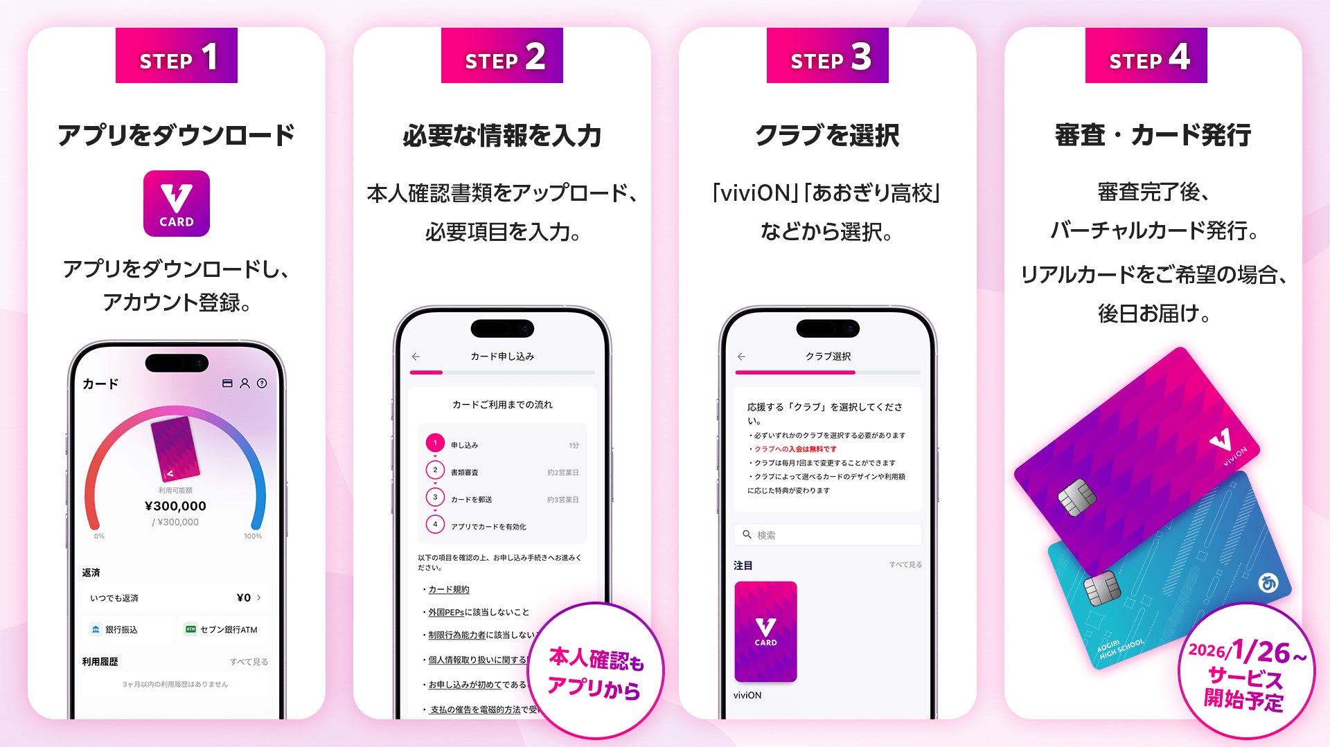 4.審査・カード発行: 審査完了後、バーチャルカードが発行されます。2026年1月26日(月)のサービス開始以降、オンラインショッピング等でご利用が可能となる予定です。
