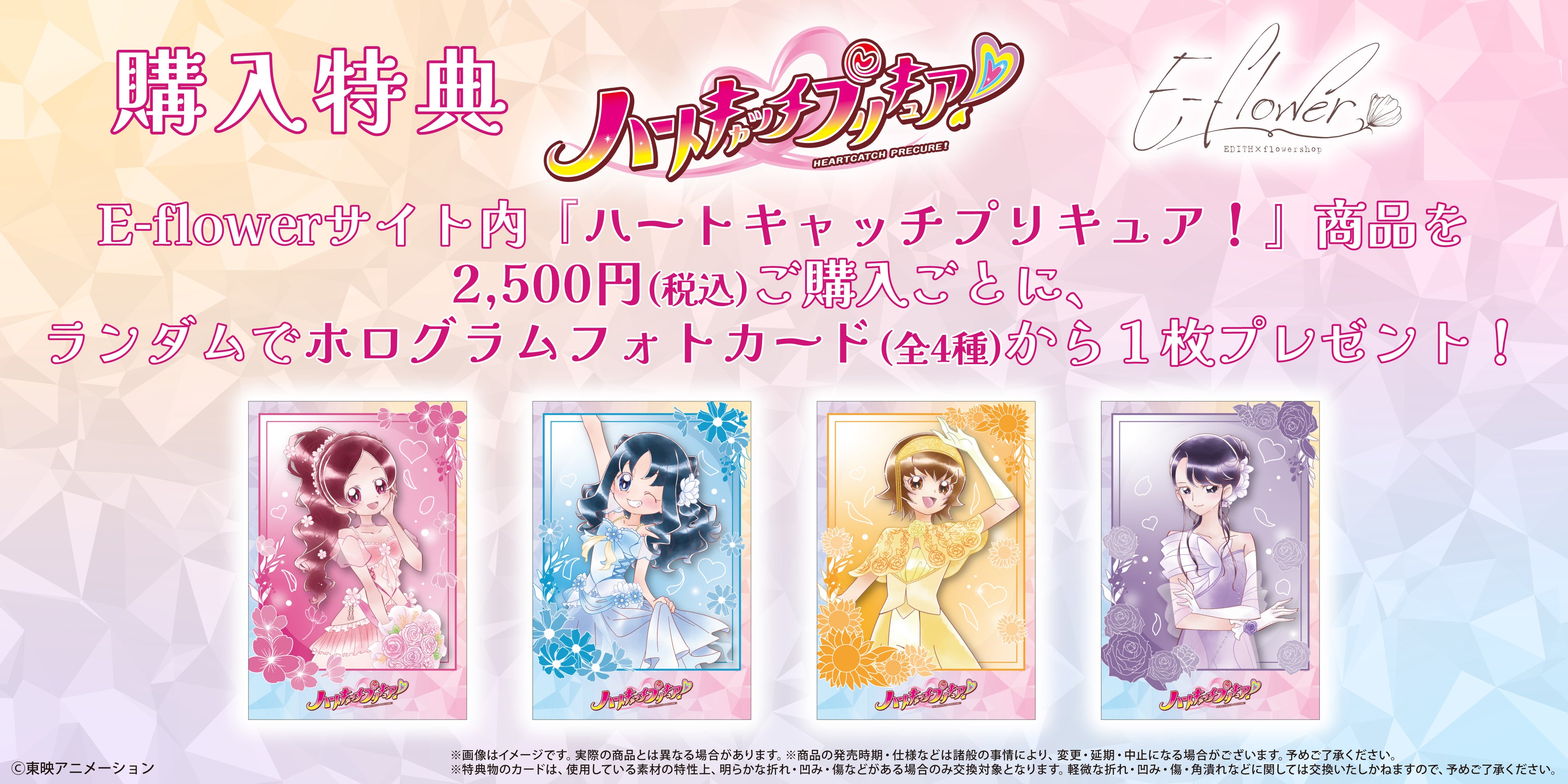 E-flower通販サイト内で『ハートキャッチプリキュア!』商品を2,500円(税込)ご購入ごとに、ランダムで「ホログラムフォトカード(全4種)」から1枚プレゼント。